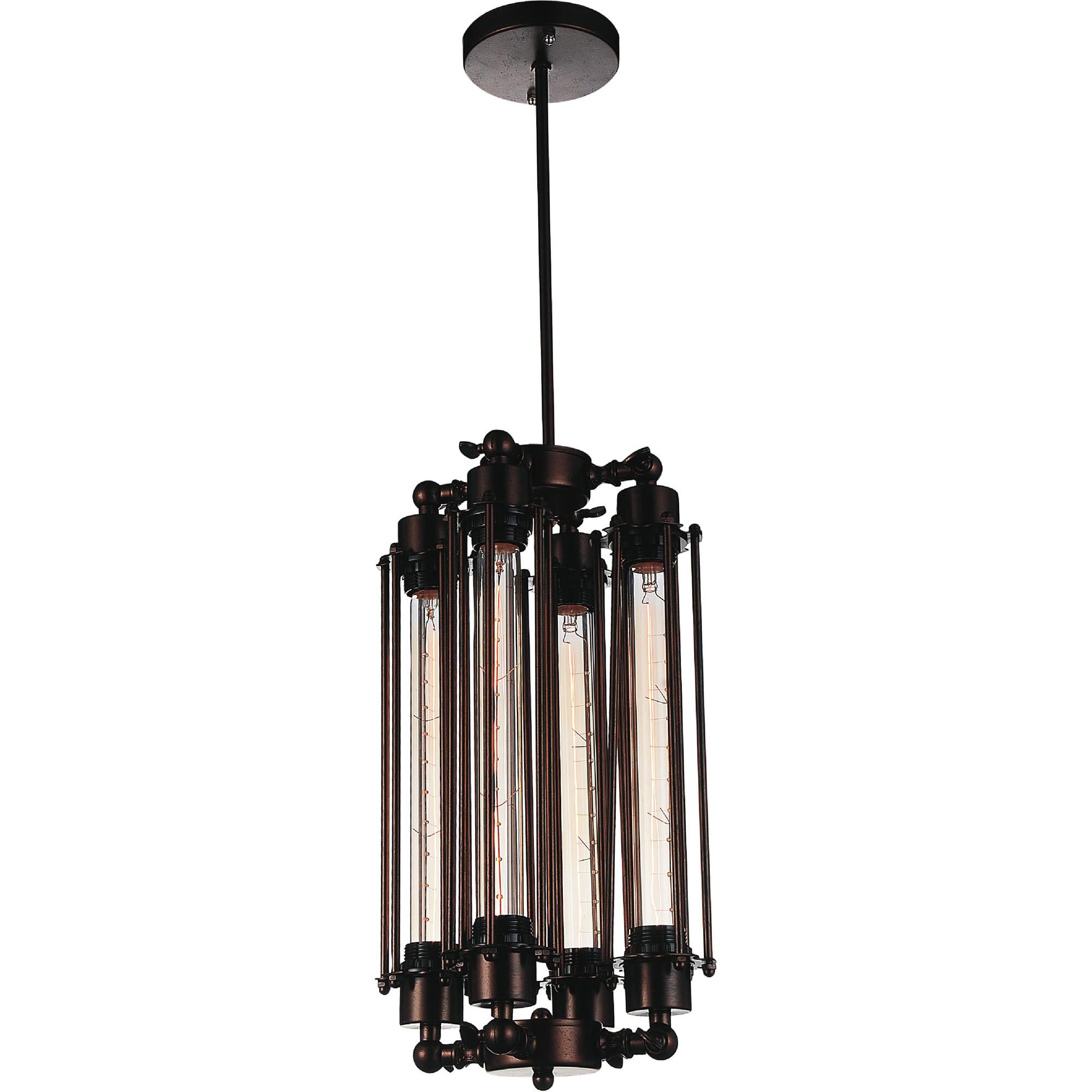 - With a gear clock, an old globe, a brick wall, and this light source, your steampunk home will be complete. The Kiera 4 Light Pendant will provide your space not just with light but also with a charming industrial style. The metal pipe construction and tube shaped bulbs of this chocolate colored down mini pendant assure you of a space glowing with character.