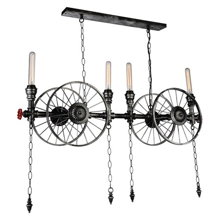 Greet guests to your place with this oversized Rio 4 Light Chandelier and take them back to the time when technology changed the way we live. This industrial up chandelier in grey displays tube shaped bulbs in contrast with circular wheel like accents on the frame. Inspired by a wagon, this light fixture will make a dramatic statement piece in a high ceiling space.
