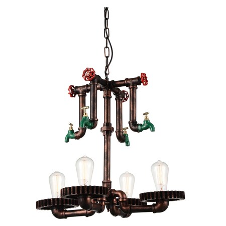 One of the most unique light fixtures you'll find. The Soto 4 Light Chandelier is clearly not lacking in style. This up chandelier in speckled copper comes with a pipe frame with gears, valves, and faucet fittings. Measuring 23 inches in diameter, this light source may be medium in size but it's big in impact. Perfect over a coffee table, a dining table, and a pool table, this unusual fixture is what you need to make your living space uniquely your own.Lighting is jewelry for the home, and there is the perfect piece for every room. This fixture is done in a beautiful speckled copper finish which could be the missing piece to lighten up and fall in love with your space all over again.<br/><br/>Features :<br/><br/>- Feel confident with your purchase and rest assured. This fixture comes with a one year warranty against manufacturers defects to give you peace of mind that your product will be in perfect condition.<br/>- Dimensions: H 22" x W 23" x L 23"<br/>- Speckled Copper Finish - E26 Bulb Not Included - Indoor (Dry Location)<br/>- cETLus Approved<br/>- Includes Assembly Instructions and Hardware<br/>- Compatible With Standard Low Voltage Dimmer.<br/><br/>Specifications :<br/><br/>- Number of Lights : 4<br/>- Voltage : 120v<br/>- Bulb Type : E26<br/>- Warranty Description : One year warranty against manufacturers defect<br/>- Installation Type : Hardwired<br/>- Material : Metal.
