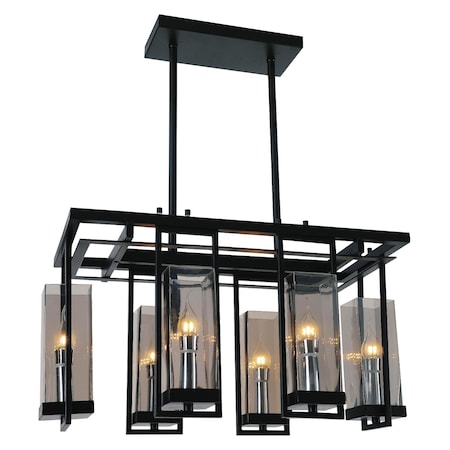The Vanna 6 Light Chandelier makes a striking statement with its well-defined lines and classic black finish paired with smoke-colored rectangular prisms. Inside each glass candleholder is a flame-shaped bulb that delivers diffused light perfect for creating an ambiance in your dining room or kitchen. This 27 inch rectangular up chandelier will suit modern and contemporary spaces.Lighting is jewelry for the home, and there is the perfect piece for every room. This fixture is done in a beautiful black finish which could be the missing piece to lighten up and fall in love with your space all over again.<br/><br/>Features :<br/><br/>- Feel confident with your purchase and rest assured. This fixture comes with a one year warranty against manufacturers defects to give you piece of mind that your product will be in perfect condition.<br/>- Dimensions: H 15" x W 14" x L 27"<br/>- Black Finish - E12 Bulb Not Included - Indoor (Dry Location)<br/>- cETLus Approved<br/>- Includes Assembly Instructions and Hardware<br/>- Compatible With Standard Low Voltage Dimmer.<br/><br/>Specifications :<br/><br/>- Number of Lights : 6<br/>- Voltage : 120v<br/>- Bulb Type : E12<br/>- Warranty Description : One year warranty against manufacturers defect<br/>- Installation Type : Hardwired<br/>- Material : Metal.