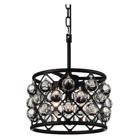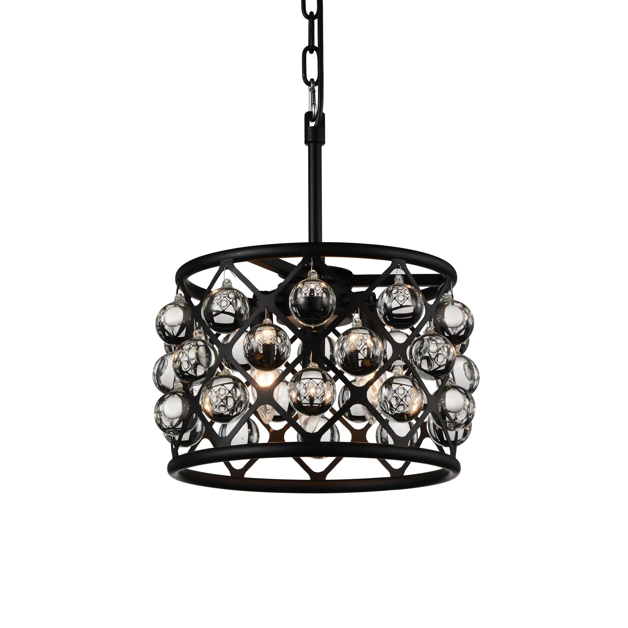 Meant for the modernistic and the space-conscious, the Renous 3 Light Pendant will deliver a big style upgrade to your home while taking a little space. This is a 12 inch chandelier fashioned with a metal shade in grid design. Each empty grid space is filled with a crystal ball. Finished in a foolproof color, this black chandelier will go with everything and will always make your space look dressed-up.Lighting is jewelry for the home, and there is the perfect piece for every room. This fixture is done in a beautiful black finish which could be the missing piece to lighten up and fall in love with your space all over again.<br/><br/>Features :<br/><br/>- Feel confident with your purchase and rest assured. This fixture comes with a one year warranty against manufacturers defects to give you piece of mind that your product will be in perfect condition.<br/>- Dimensions: H 15" x W 12" x L 12"<br/>- Black Finish - E12 Bulb Not Included - Indoor (Dry Location)<br/>- cETLus Approved<br/>- Includes Assembly Instructions and Hardware.<br/>- Compatible With Standard Low Voltage Dimmer<br/>- Comes With 72" of chain.<br/><br/>Specifications :<br/><br/>- Number of Lights : 3<br/>- Voltage : 120v<br/>- Bulb Type : E12<br/>- Warranty Description : One year warranty against manufacturers defect<br/>- Installation Type : Hardwired<br/>- Material : Metal.
