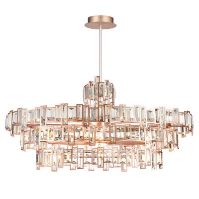 - A crystal head turner, the Quida 21 Light Chandelier is a standout statement piece ready to give your space a hint of glitz combined with an Old World charm. This sizeable down chandelier measures 44 inches wide and is designed with a geometric metal frame in a beautiful champagne finish. Clear crystal prisms adorn this light fixture that sheds a luxurious glow from its 21 G9 bulbs.
