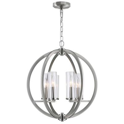 - Its style is a pared back take on that trendy orbital chandelier.The Elton 6 Light Chandelier will impress you with its unassuming beauty. Held by an adjustable chain is an orbit like pendant in satin nickel finish. Sitting inside are six candelabra bulbs on cylindrical glass shades. This 19 inch orbit chandelier will fit rustic upscale or modern rustic interiors.
