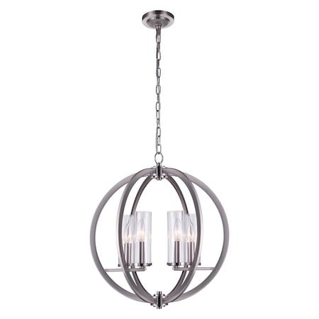 Its style is a pared back take on that trendy orbital chandelier.The Elton 6 Light Chandelier will impress you with its unassuming beauty. Held by an adjustable chain is an orbit like pendant in satin nickel finish. Sitting inside are six candelabra bulbs on cylindrical glass shades. This 19 inch orbit chandelier will fit rustic upscale or modern rustic interiors.