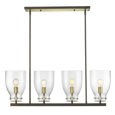 Breathe new life to your eating area with the Shelby Collection of lighting. This transitional linear chandelier adds a fresh, simple, clean look with its Bronze and Brass combination finish. The combination finish makes it easy to mix and match with your appliances and hardware. - Shelby Oil Rubbed Bronze and Antique Brass Four-Light Linear Chandelier with Clear Seedy Glass - Able to install on sloped ceiling - 6 x 12 In., 2 x 6 In., 2 x 3 In. stems included - Clean with a dry cloth - Installation hardware included - Hardwired or Plug In: Hardwired - One Year Limited Manufacturer Warranty - Bulb(s) Not Included