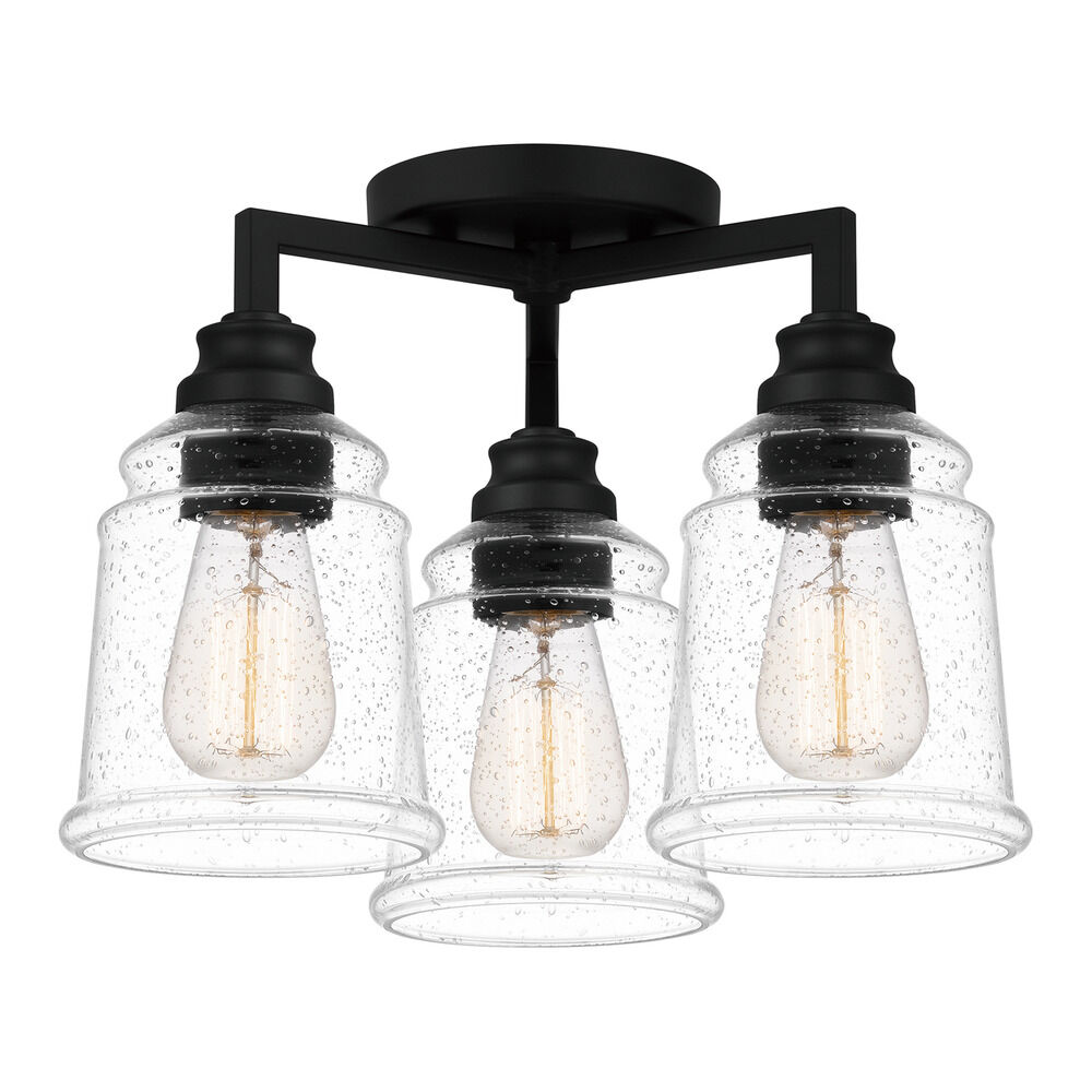 With its classic styling and clean lines, McIntire is the perfect choice to upgrade every aspect of your home. A striking matte black finish pairs perfectly with clear seedy glass for a bold yet subtle contrast - proving that simple does not have to mean boring. This versatile collection is available as a mini pendant, flush mount, pendant, island light, chandelier, or bath light. Three Light Flush Mount from the McIntire collection in Matte Black finish