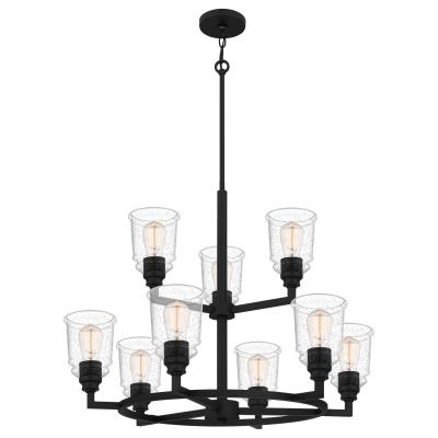 With its classic styling and clean lines, McIntire is the perfect choice to upgrade every aspect of your home. A striking matte black finish pairs perfectly with clear seedy glass for a bold yet subtle contrast - proving that simple does not have to mean boring. This versatile collection is available as a mini pendant, flush mount, pendant, island light, chandelier, or bath light. Nine Light Chandelier from the McIntire collection in Matte Black finish