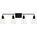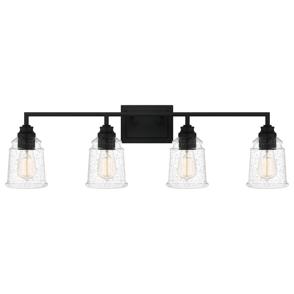 With its classic styling and clean lines, McIntire is the perfect choice to upgrade any bathroom vanity. A striking matte black finish pairs perfectly with clear seedy glass shades for a bold yet subtle contrast - proving that simple does not have to mean boring. This versatile bath light is available as a one, two, three, or four light and can be installed with shades facing up or down. Four Light Bath from the McIntire collection in Matte Black finish