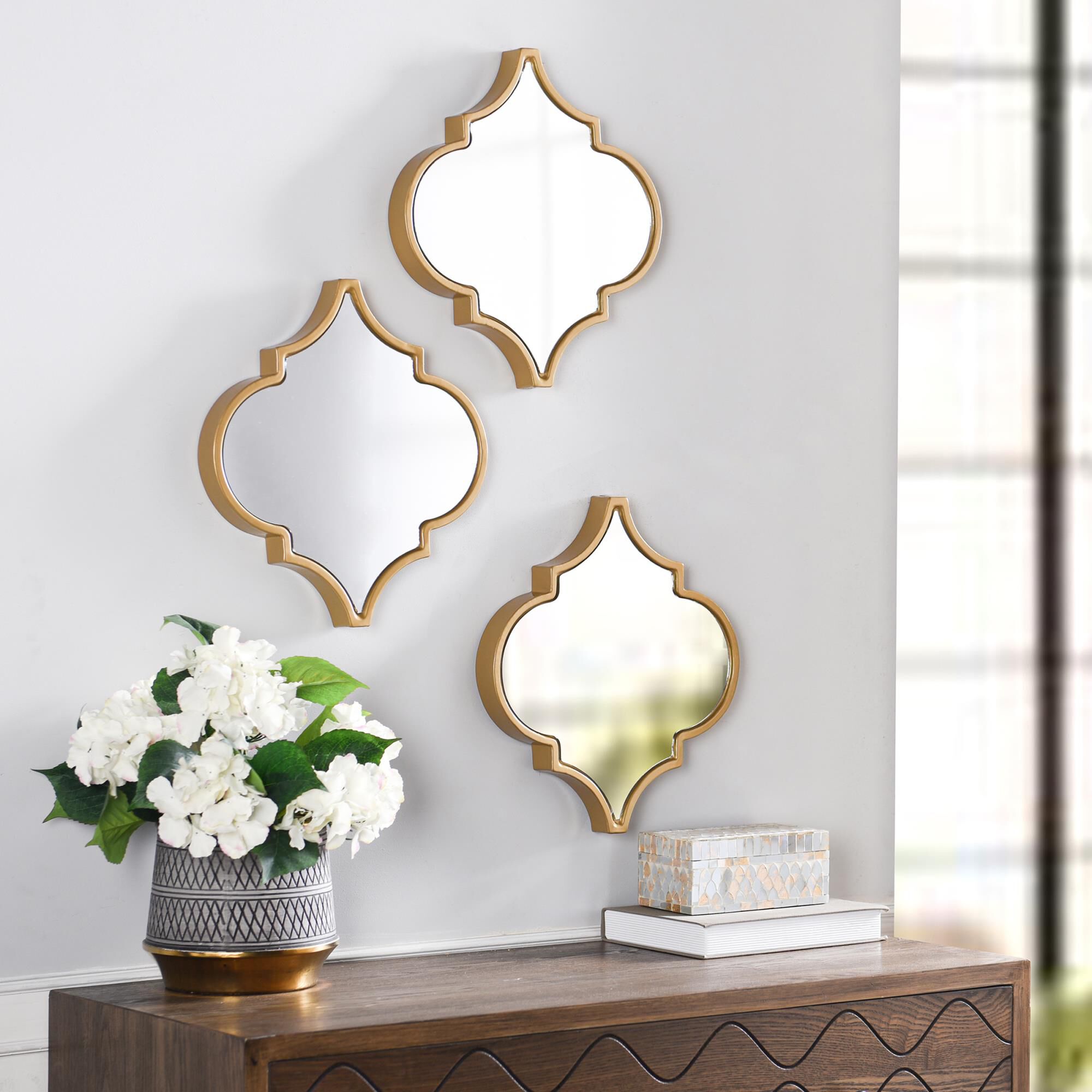 This gorgeous three-piece Delilah mirror set strikes the perfect balance of fun and function. Featuring three chic iron metal geometric shaped wall mirrors in one convenient set, you can arrange these versatile pieces together or apart to bring new life and tons of added dimension to a living room, bedroom hallway or office space. </ul><li>Install orientation: Vertical / Wall mount hardware: D-Ring / Mirror without frame dimensions: 11.6 inches high x 13 inches wide x 0.16 inches thick / Each Piece is: 12.8 x 1.38 x 14.25.