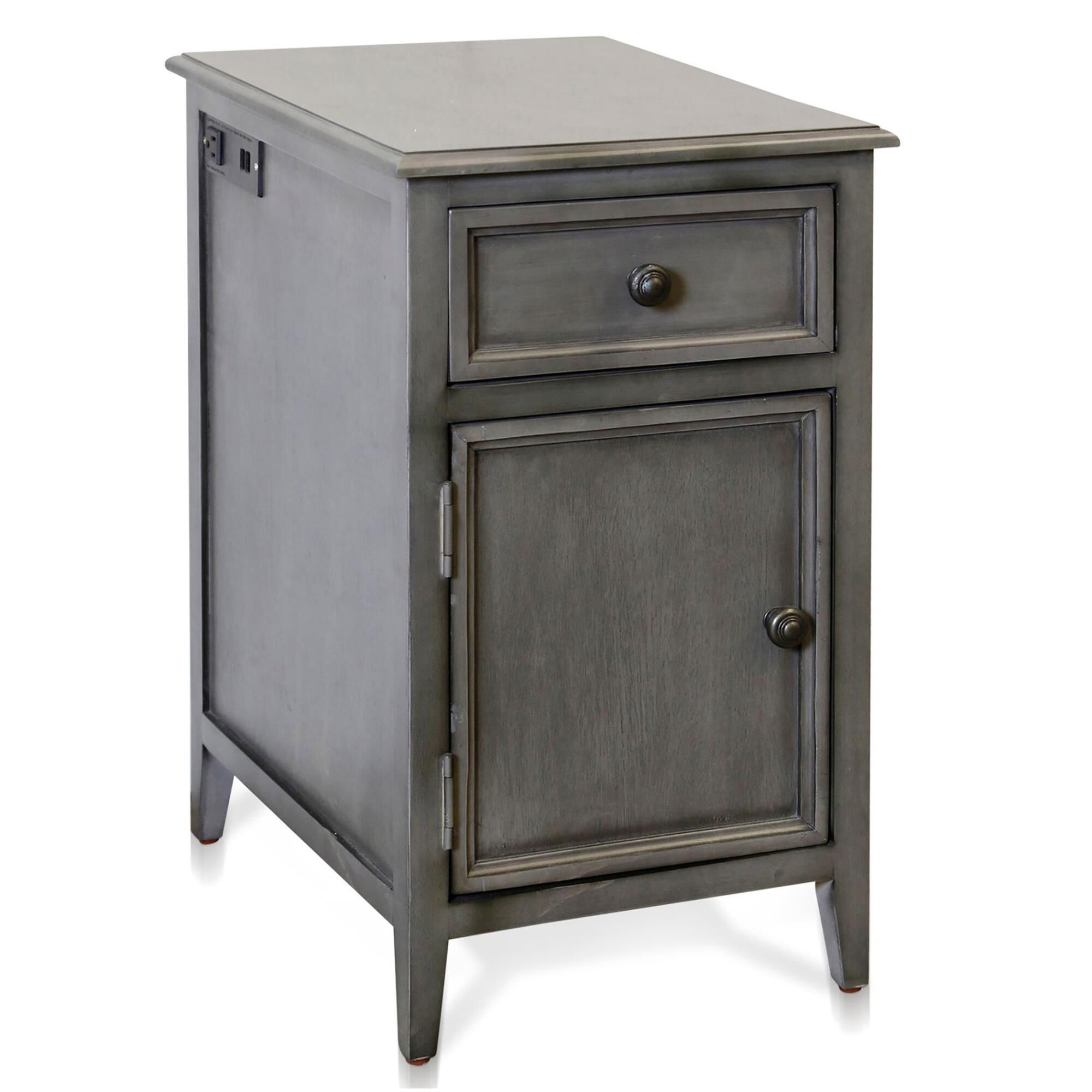 Vintage Gray Side Table With Drawer And Cabinet 15In W. X 25In Ht. X 19In D.FeaturesDue To The Production Process, Each Piece Is Unique And No Two Are Exactly Alike.This side table has a thin yet usable design that fits perfectly as a nightstand and offers a great deal of storage with the drawer and door.This piece is unique as it has 2 USB 100V outlets and a regular outlet plugin to provide the ultimate convenience outlet.Collection: Vintage Gray Material: Mdf, Acacia Wood Color: Vintage Gray Wash Product Size: 19 x 15 x 25 Frame Color: Nc Frame Material: Solid Pine, Mdf Veneer Required Assembly: No Made In Vietnam