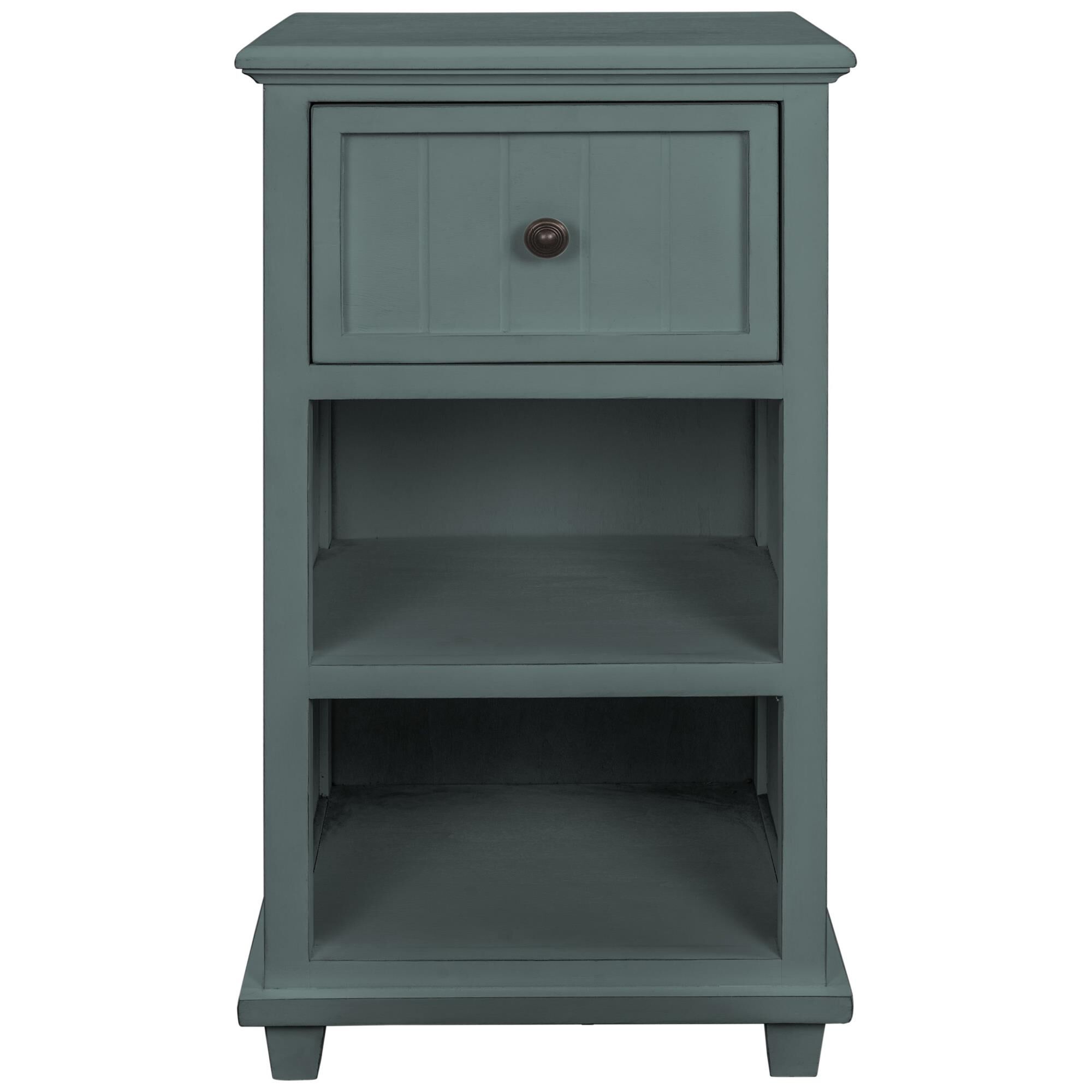 Aged Seafoam Drawer Side Table 13In W. X 30In Ht. X 16In D.FeaturesDue To The Production Process, Each Piece Is Unique And No Two Are Exactly Alike.This one drawer side table has a thin yet usable design that fits perfectly next to your bed for as needed storage.With the two cubby shelves for storage and the deep drawer - this aged seafoam painted piece is sure to be a staple piece in your home.Collection: Aged Seafoam Material: Mdf, Acacia Wood Color: Aged Seafoam Wash Product Size: 16 x 13 x 30 Frame Color: Nc Frame Material: Solid Pine, Mdf Veneer Required Assembly: No Made In Vietnam