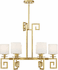 Bring a touch of Mediterranean magic to any space with the Savoy House Quatrain 6-light chandelier! It showcases Greek key detail, white opal glass shades and a beautifully textured True Gold finish that recalls gold leaf. Quatrain is 30" in width and has an adjustable height ranging from 23" to 77". Comes with four 12" downrods and one 6" downrod. Uses 6 standard size bulbs with a max of 60 watts per bulb (bulbs not included).