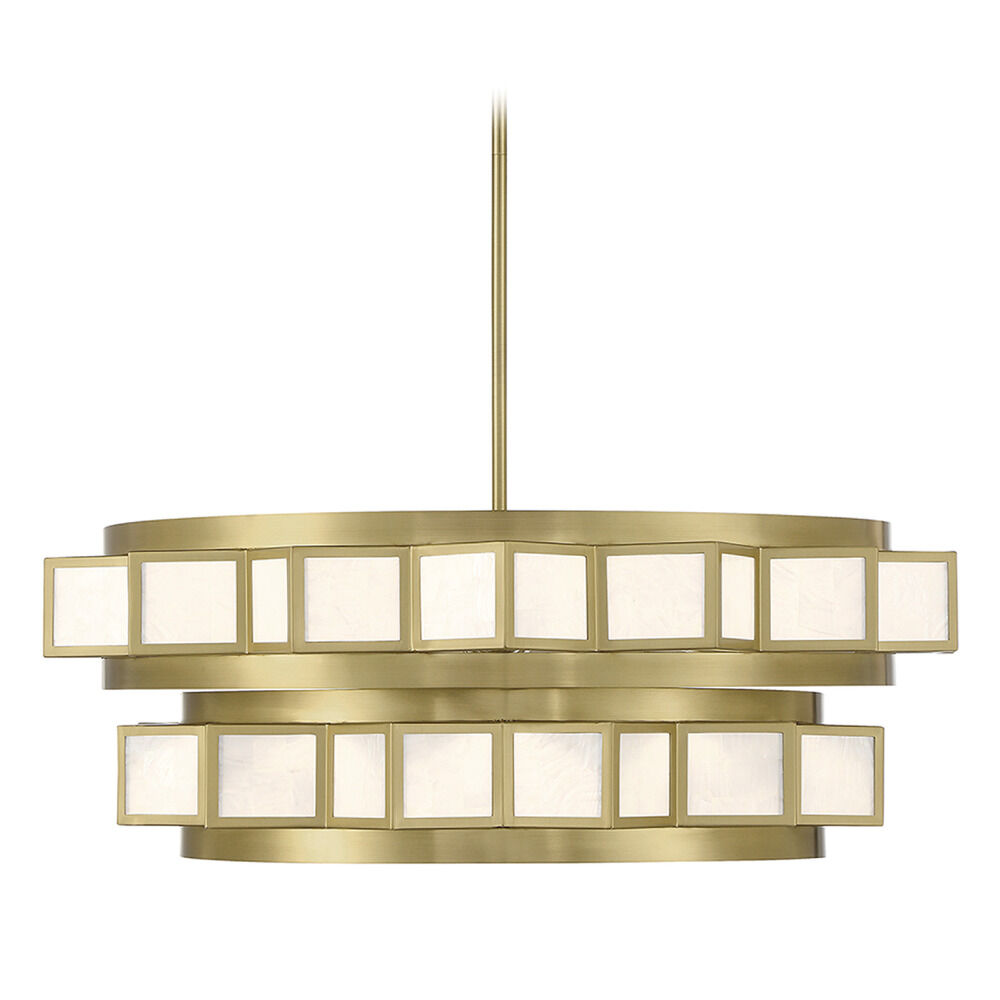 It is often said that lighting is the jewelry of the home and the Savoy House Gideon 6-light chandelier is an excellent example of this saying. Pieces of natural capiz shell are arranged into a boldly geometric frame with a warm brass finish. When the light is off, the unique swirls and patterns on the shell will mesmerize. When the light is on, the shell will create a beautifully soft glow. Gideon is 29" in width and has an adjustable height ranging from 10" to 64". Comes with four 12" downrods and one 6" downrods. It uses 6 standard size bulbs of up to 60 watts per bulb (bulbs not included).