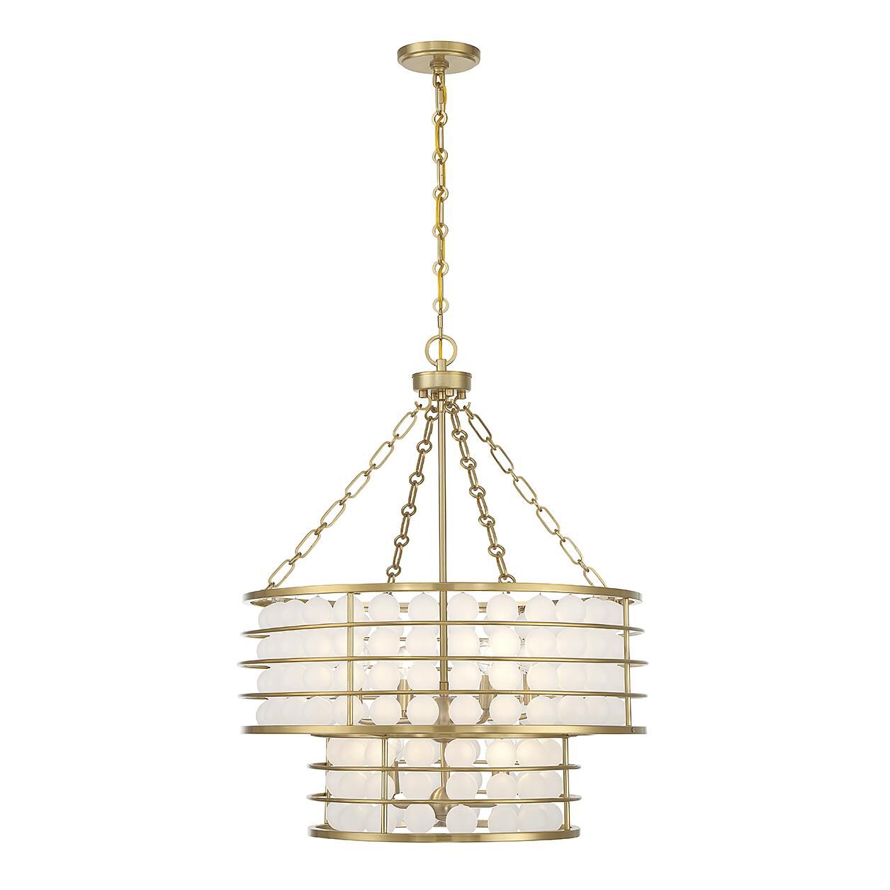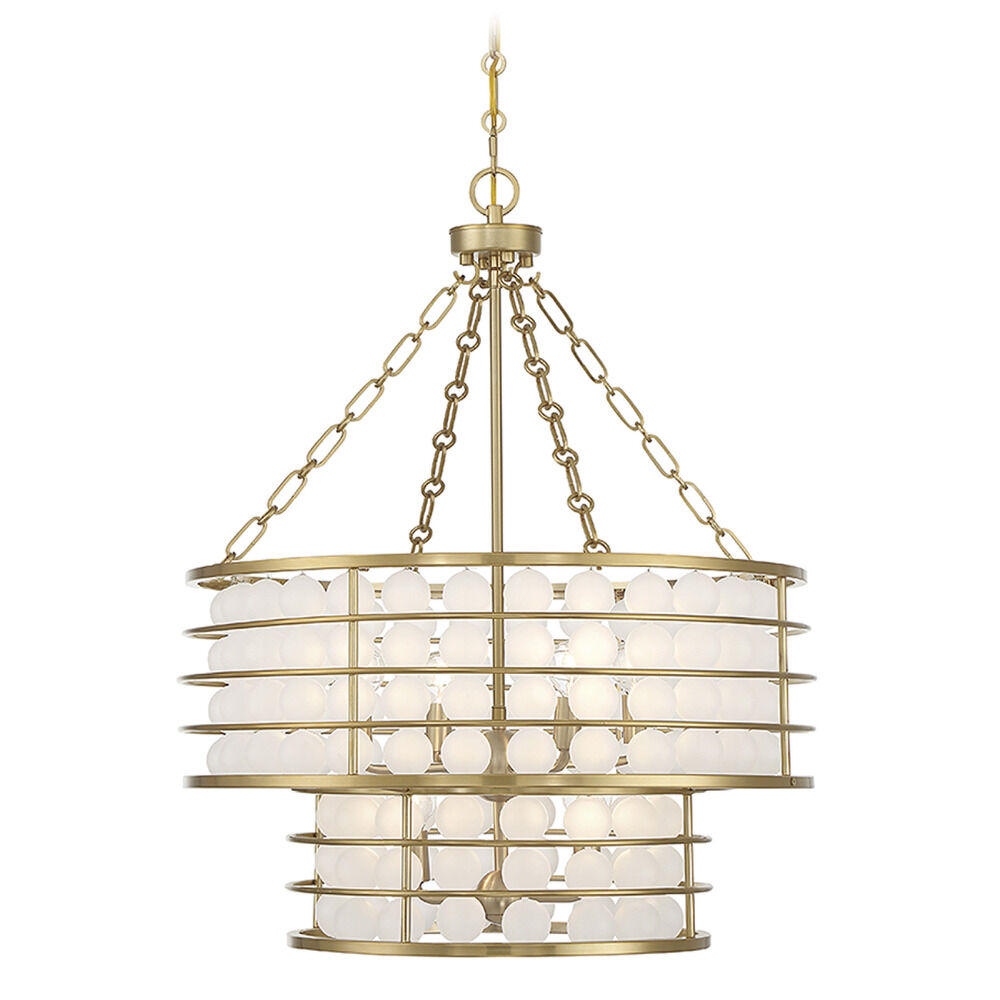 The industrial meets the glamorous in this stylish Savoy House Byron 6-light chandelier. Strands of frosted glass baubles hang inside its open and airy frame, which is finished in warm brass. Byron is 29" in height and 24" in width. It uses 6 candelabra size bulbs of up to 60 watts per bulb (bulbs not included).