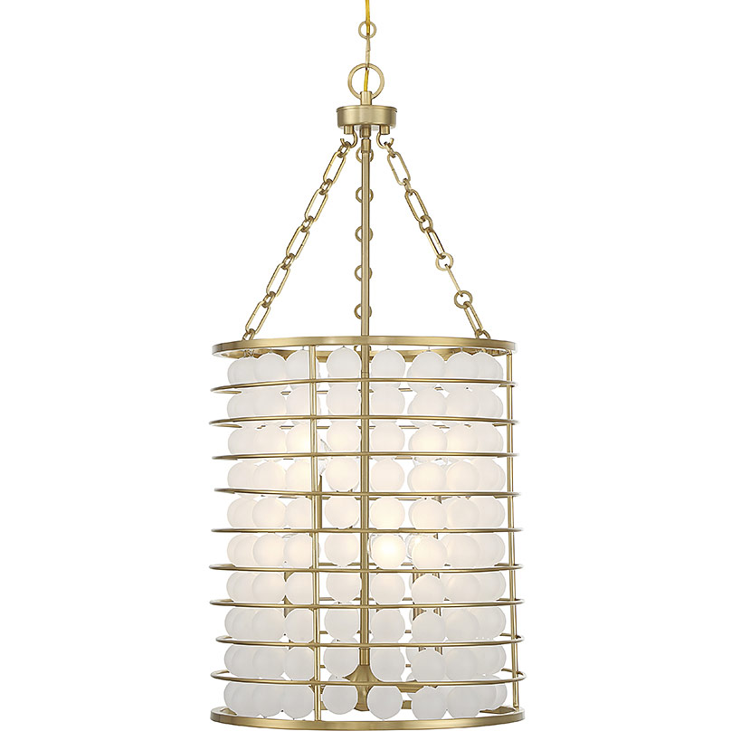 The industrial meets the glamorous in this stylish Savoy House Byron 6-light pendant. Strands of frosted glass baubles hang inside its open and airy frame, which is finished in warm brass. Byron is 34.50" in height and 16" in width. It uses 6 candelabra size bulbs of up to 60 watts per bulb (bulbs not included).
