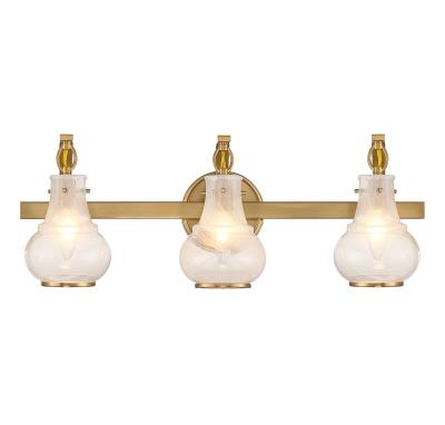 For the Adams 3-light bath vanity light, Savoy House took traditional lighting style and gave it a fashionable twist for today's stylish homes! Molded, curving shades of white strie glass offer an extra touch of eye-catching detail to go with the warm brass finish. Adams is 8.75" in height, 24" in width and extends 7" from the wall. Uses 3 candelabra size bulbs with a max of 60 watts per bulb (bulbs not included).