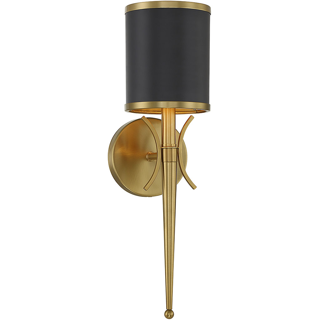 The Savoy House Quincy 1-light sconce showcases bold, stately style with its classic shape, thoughtful detailing and warm brass finish. The matte black metal shade will create indirect yet dramatic lighting. Quincy is 18.50" in height, 5.25" in width and extends 7" from the wall. It uses 1 candelabra size bulb with a max of 60 watts (bulb not included).