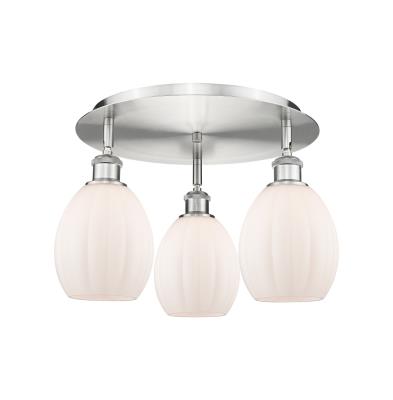 INNOVATIONS 516-3C-SN-G81 Eaton 3 17.25 inch Flush Mount Satin Nickel. Style: Industrial, Restoration-Vintage, Transitional . Collection Name: Downtown Urban. Metal Finish(Body): Satin Nickel. Metal Finish(Shade): Matte White. Material: Steel, Cast Brass, Glass. Dimension(in): 10.5(H) x 17.25(W) x 17.25(Dia). Bulb: (3)60W Medium Base Incandescent(Not Included). Voltage: 120. Dimmable: Yes. Color Temperature (Kelvin): 2200. Color Rendering Index (CRI): 99.9. Lumens: 220. Life Expectancy (Hours): 2000. Glass Shade Description: Matte White Eaton. Glass Type: Frosted. Shade Shape: Globe/Orb. Glass or Metal Shade Color: Matte White. Shade Material: Glass. Shade Dimension(in): 5.5(W) x 7(H). Fitter Measurement (Glass Or Metal Shade Fitter Size): Neckless with a 1.625 inch opening. California Proposition 65 Warning Required: Yes. UL/ETL Certification Type: Damp Location.