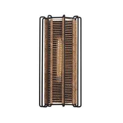 A textured black framework is wrapped in natural jute on the interior to create a modern industrial style that looks rustic yet elevated. The metal frame is vertical and the rope detail runs horizontal forming a dynamic silhouette that feels fresh. The lantern is available in three different sizes to suit any space.
