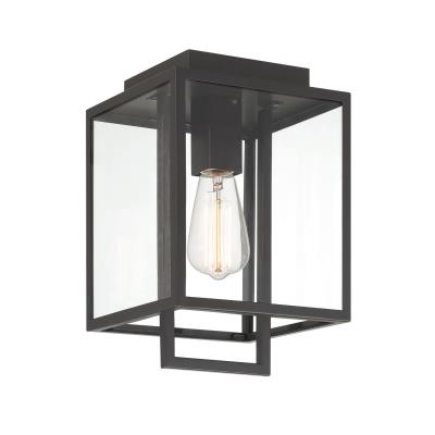 Preston outdoor light fixtures from Designers Fountain add a modern aesthetic to any outdoor space. The minimalist design and large clear glass panels will provide maximum illumination to your patio or porch. The Preston flush mount is suitable for damp exterior or indoor environments and should be wired to a 120V power source.
