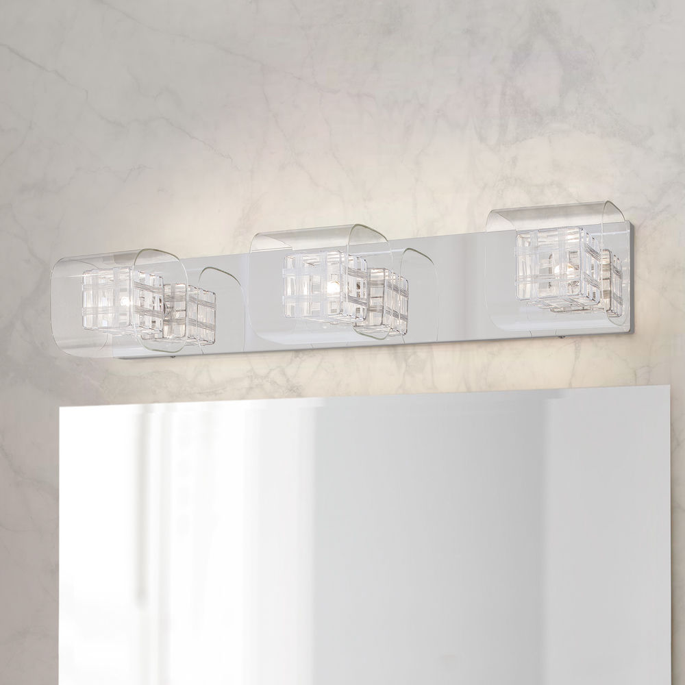 This Three Light Vanity is part of the Jewel Box Collection and has a Chrome Finish and Clear With Aluminum Cage Glass.