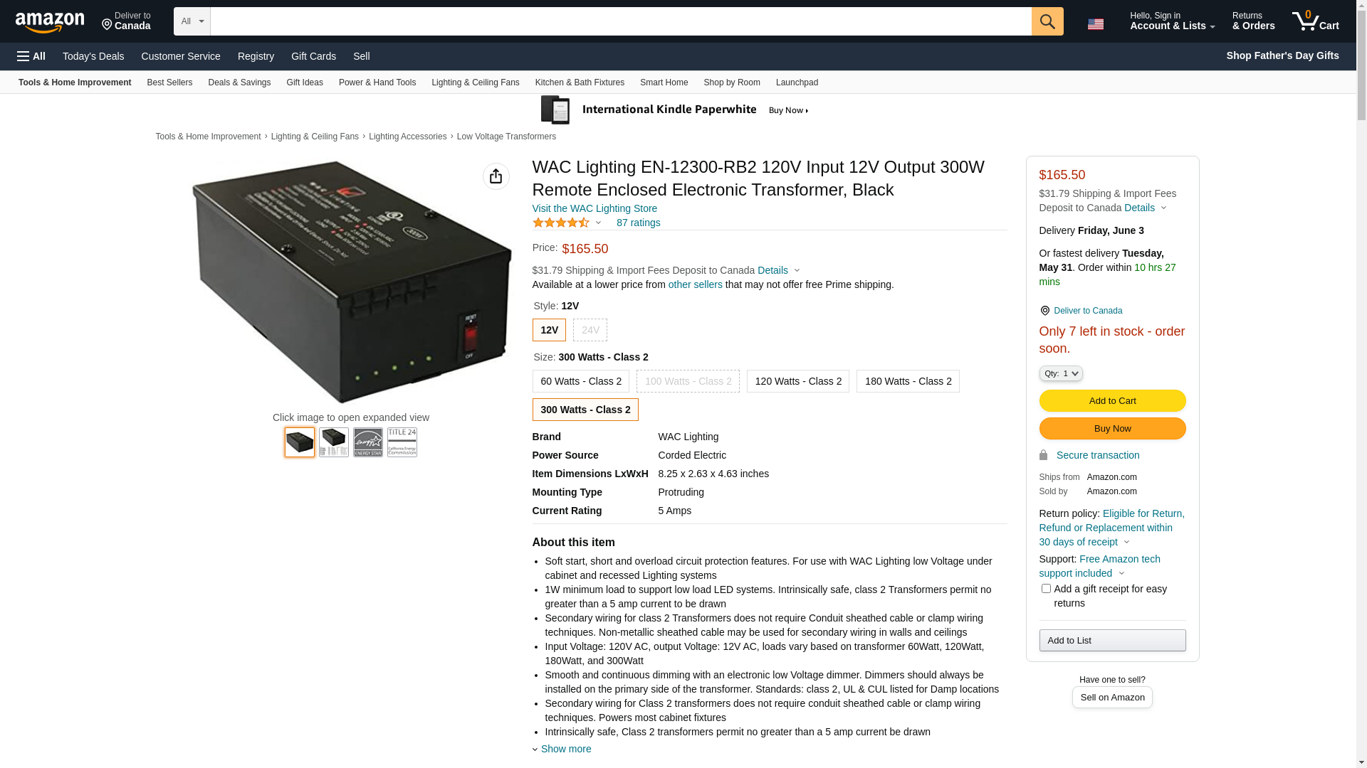 WAC Lighting EN-12300-RB2 120V Input 12V Output 300W Remote Enclosed Electronic Transformer, Black