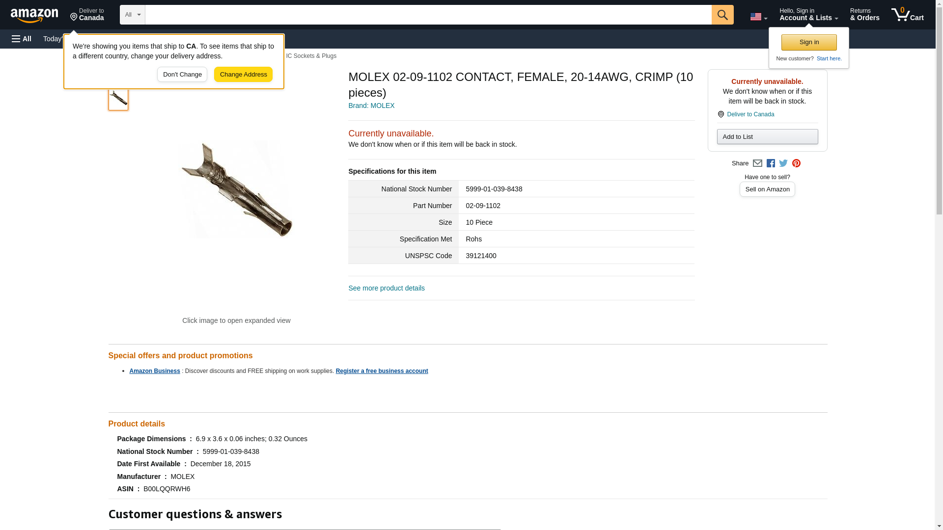 Product Description Molex 02-09-1102 Contact, Female, 20-14Awg, Crimp