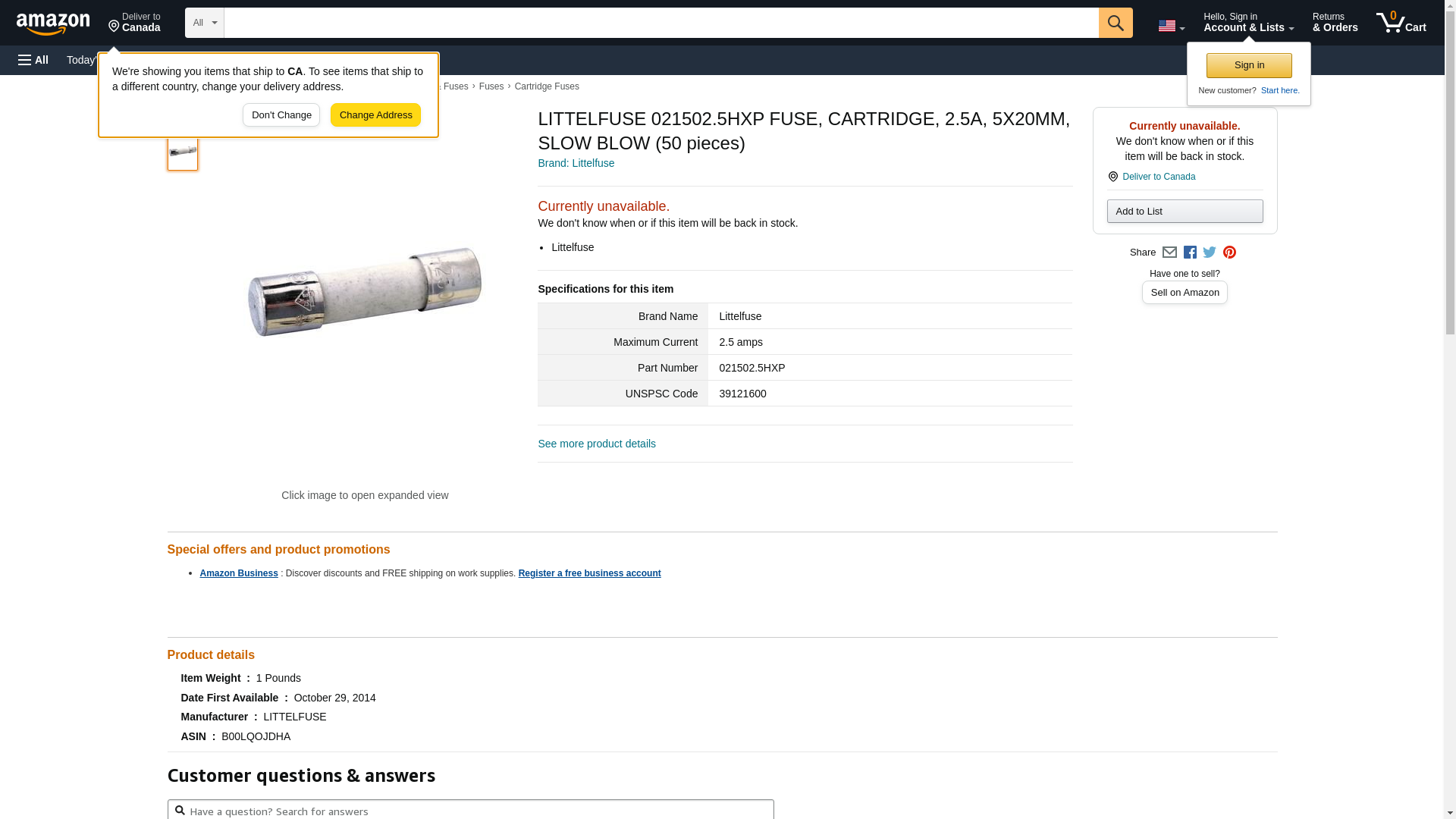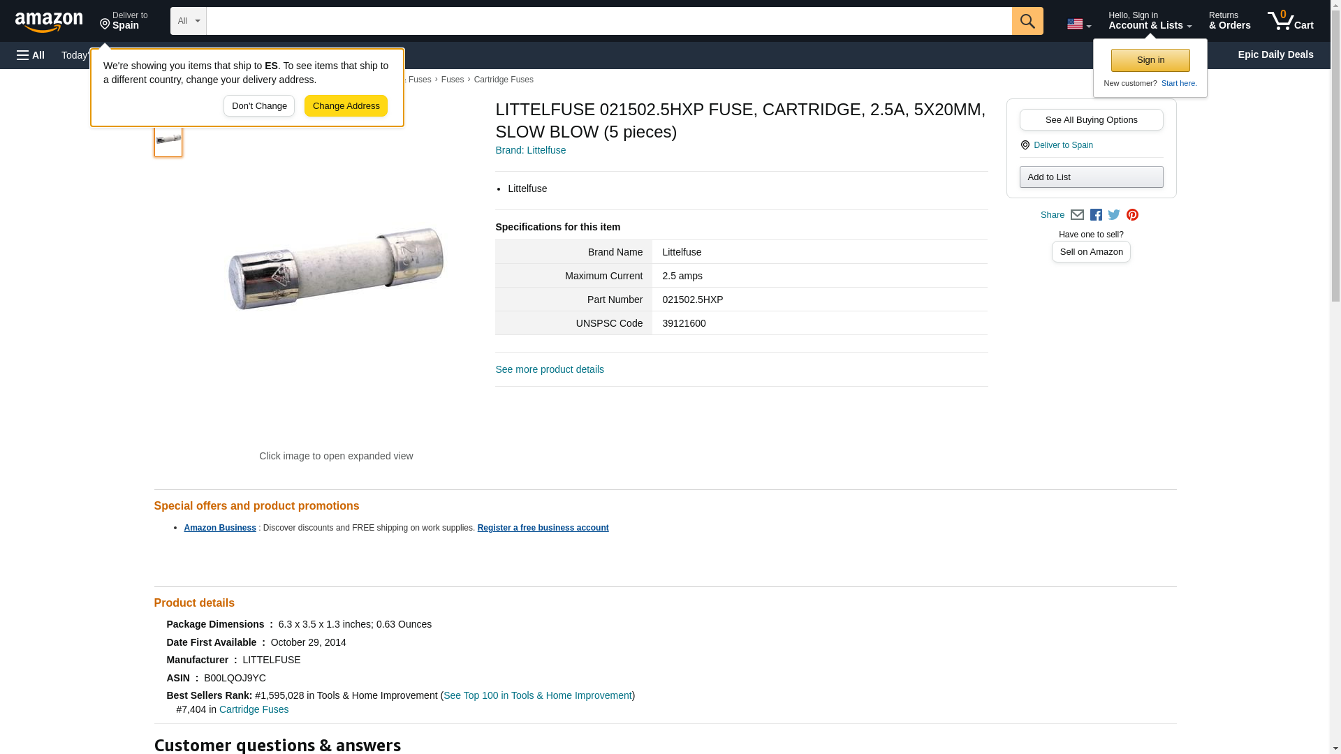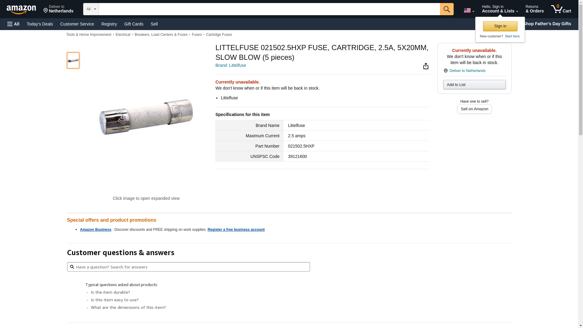 LITTELFUSE 021502.5HXP FUSE, CARTRIDGE, 2.5A, 5X20MM, SLOW BLOW (500 pieces)