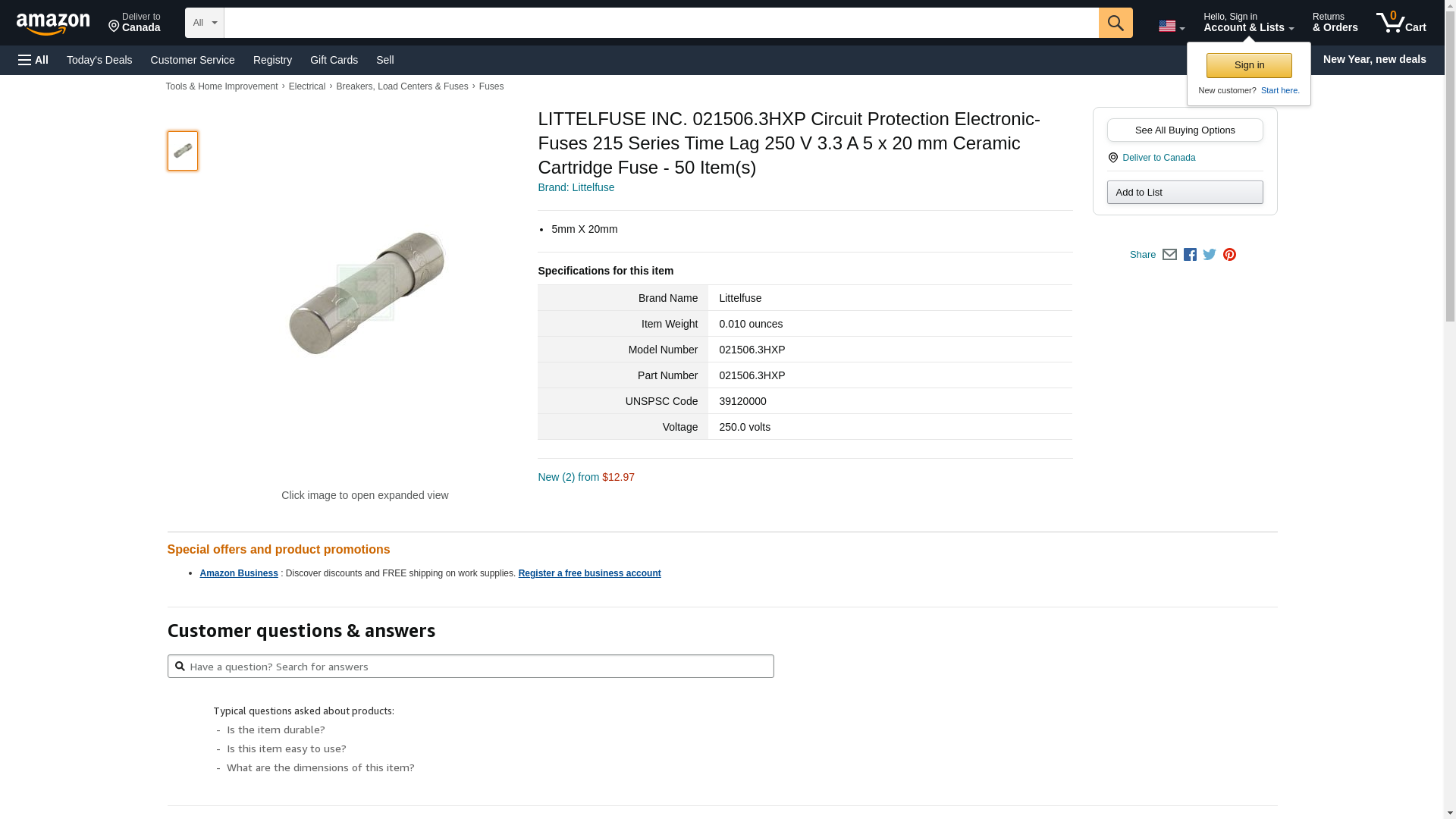 LITTELFUSE INC. 021506.3HXP Circuit Protection Electronic-Fuses 215 Series Time Lag 250 V 3.3 A 5 x 20 mm Ceramic Cartridge Fuse - 50 Item(s)