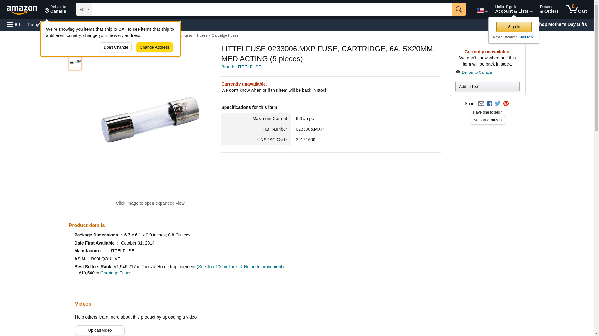 Littelfuse Cartridge Fuse, Medium Acting, 6A, 125V - 0233006.MXP
