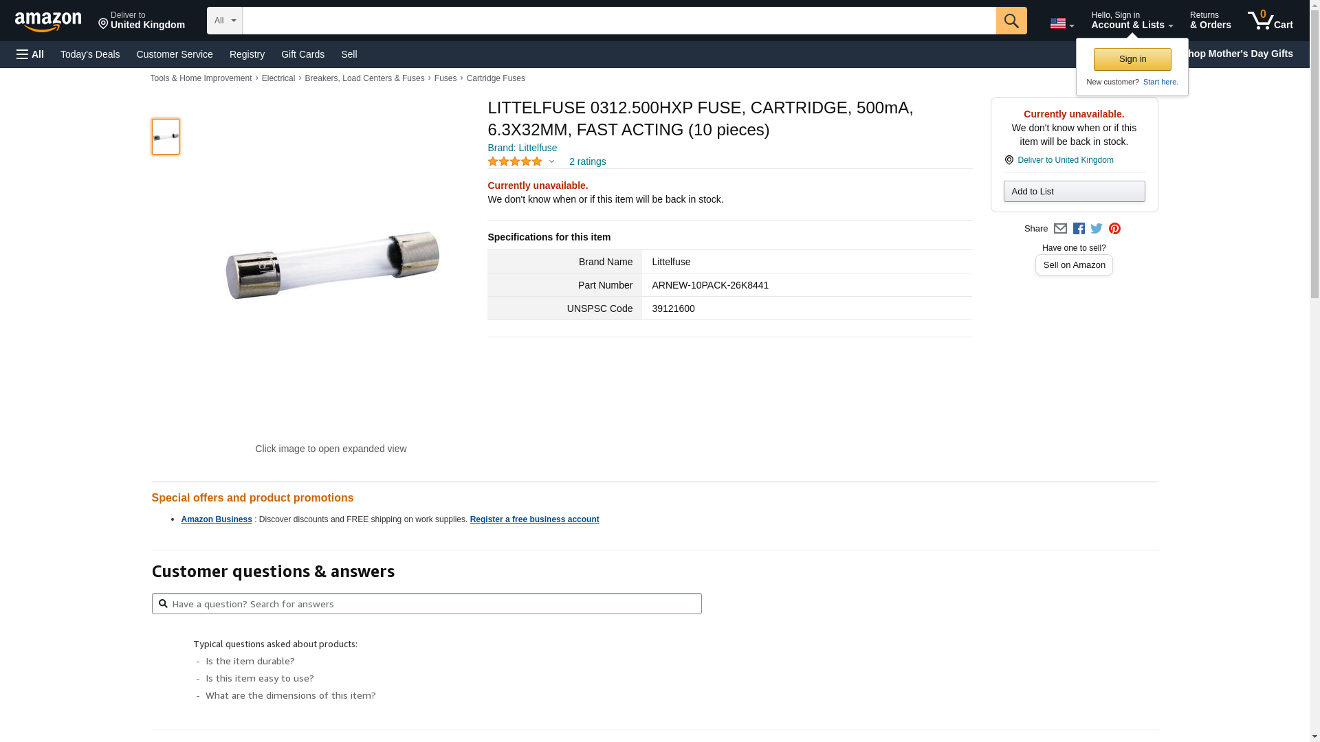 | Feature | LITTELFUSE 0312.500HXP FUSE, CARTRIDGE, 500mA, 6.3X32MM, FAST ACTING |