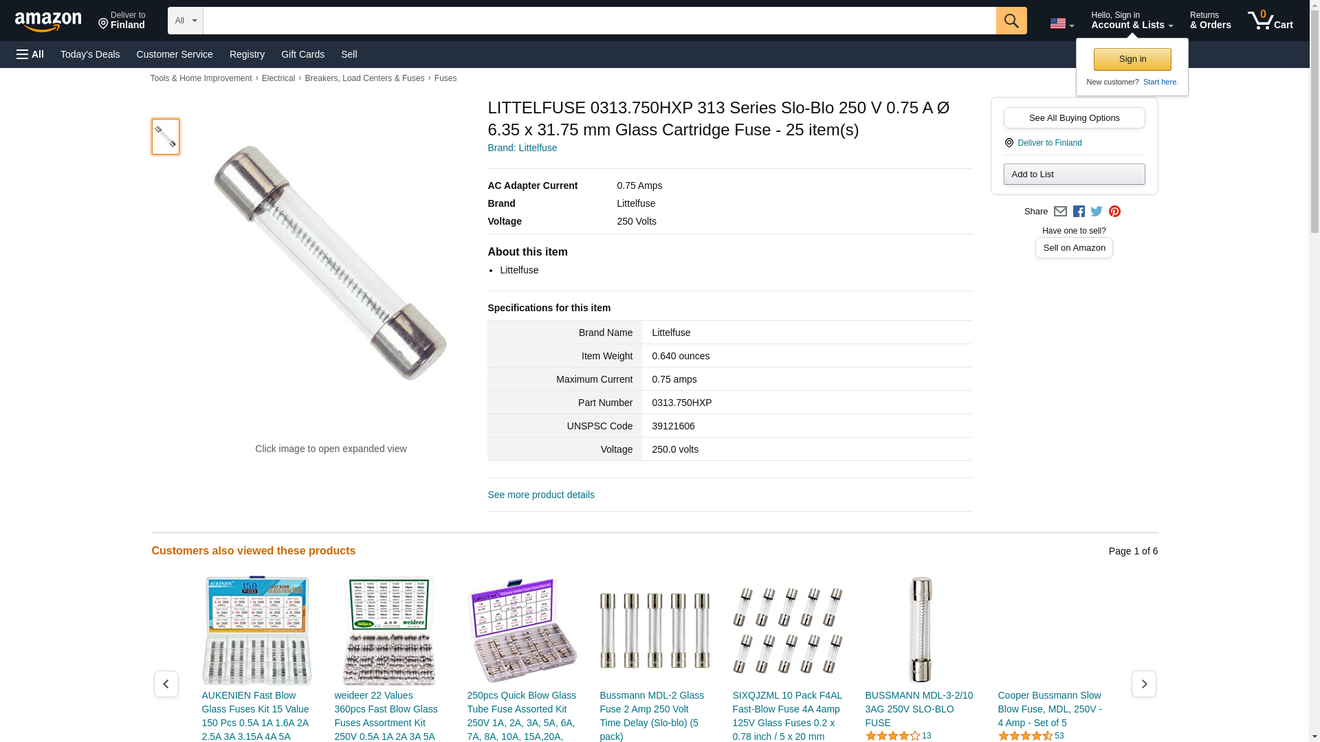 LITTELFUSE 0313.750HXP 313 Series Slo-Blo 250 V 0.75 A Ø 6.35 x 31.75 mm Glass Cartridge Fuse - 25 item(s)
