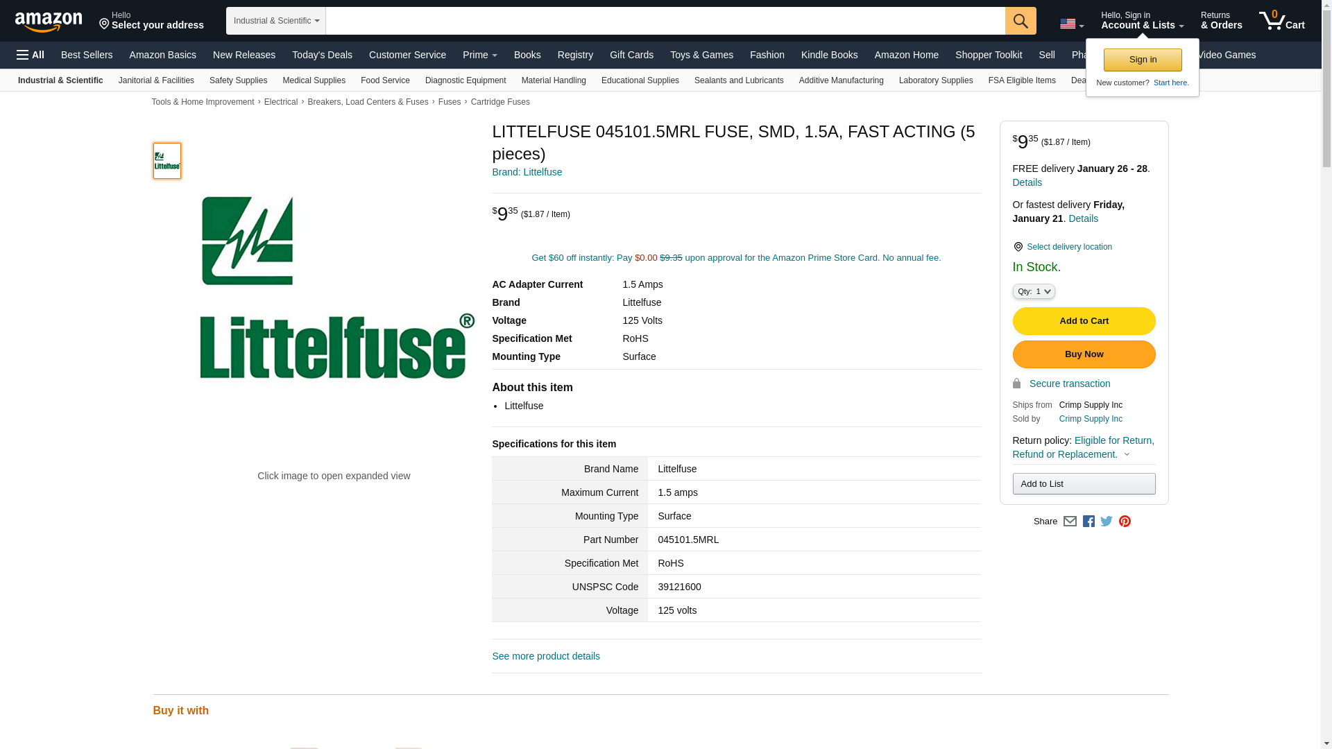 - Price For: 1 Cut tape Voltage Rating VAC: 125V Voltage Rating VDC: 125V Fuse Current: 1.5A Breaking Capacity: 300A @ 32VDC / 50A @ 125VAC/VDC Blow Characteristic: Very Fast Acting Series: 451 Fuse Case Style: SMD RoHS Compliant: Yes