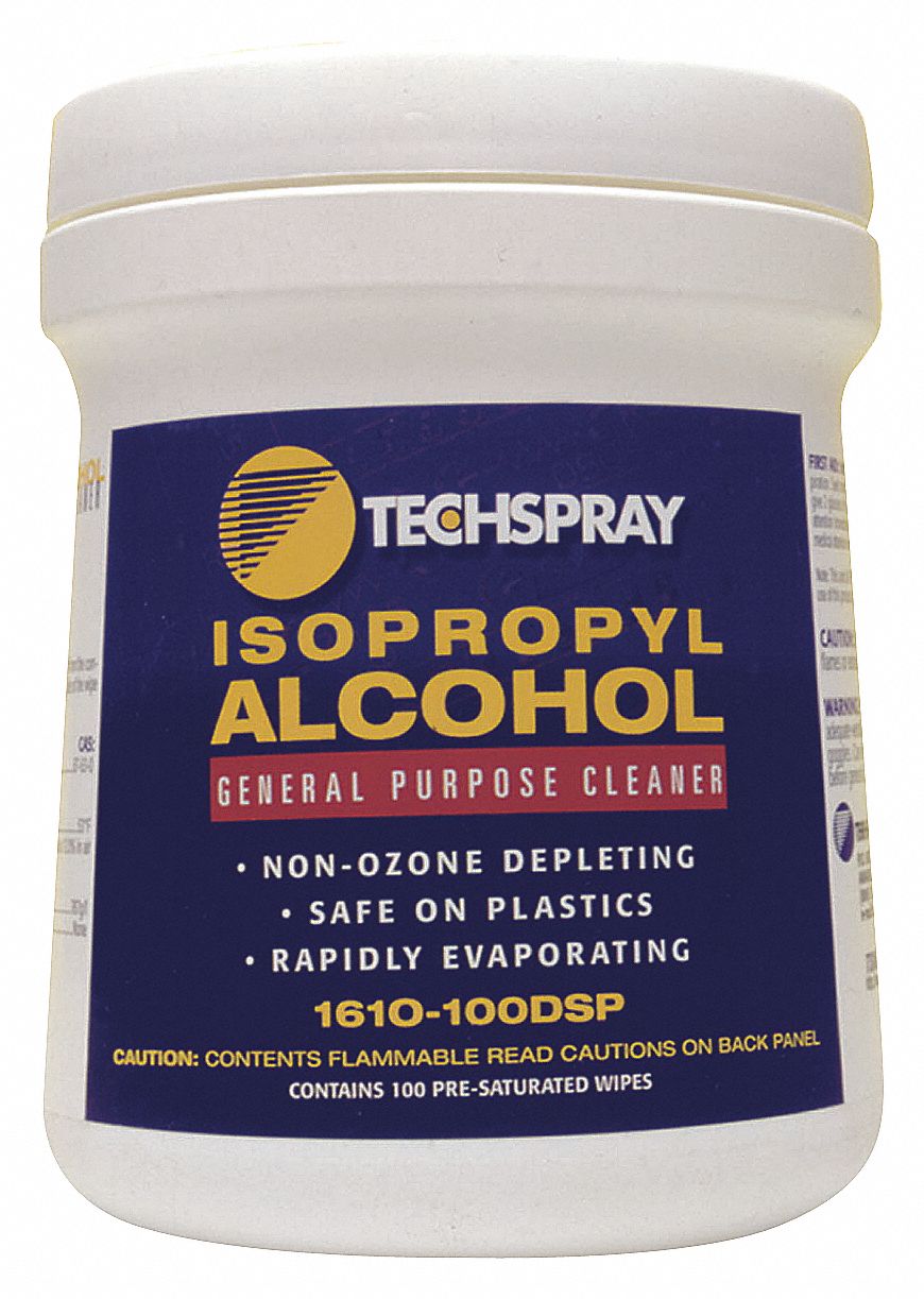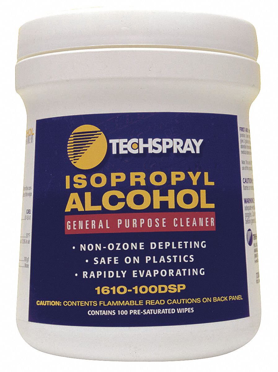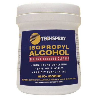 TECHSPRAY 1610-100DSP Isopropyl Alcohol Pre-Saturated Wipes in Pop-Up Dispenser. 100 pre-sat wipes in pop-up dispenser. Convenient, low-linting wipes are pre-saturated with 99.8% pure IPA. Ideal for electronics cleaning Plastic-safe Lint-free & tear resistant