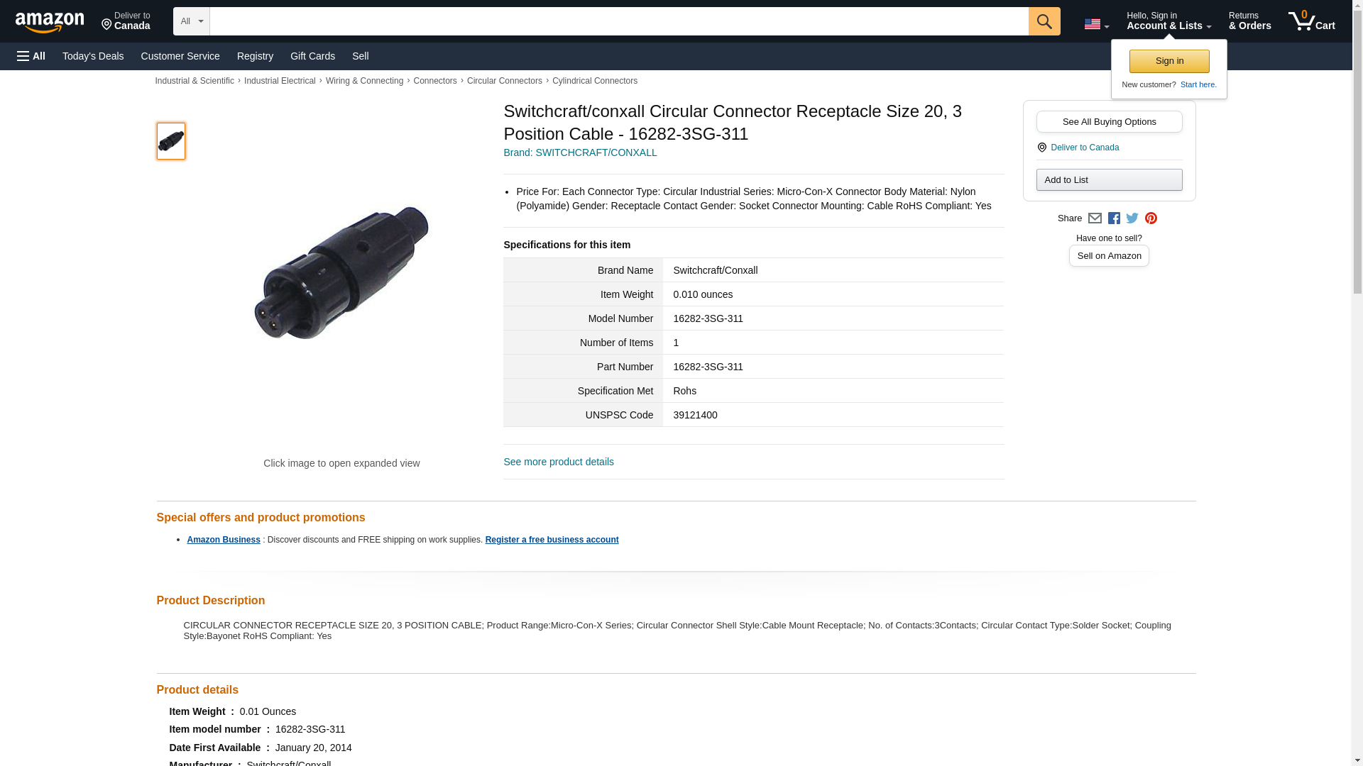 Switchcraft/conxall Circular Connector Receptacle Size 20, 3 Position Cable - 16282-3SG-311