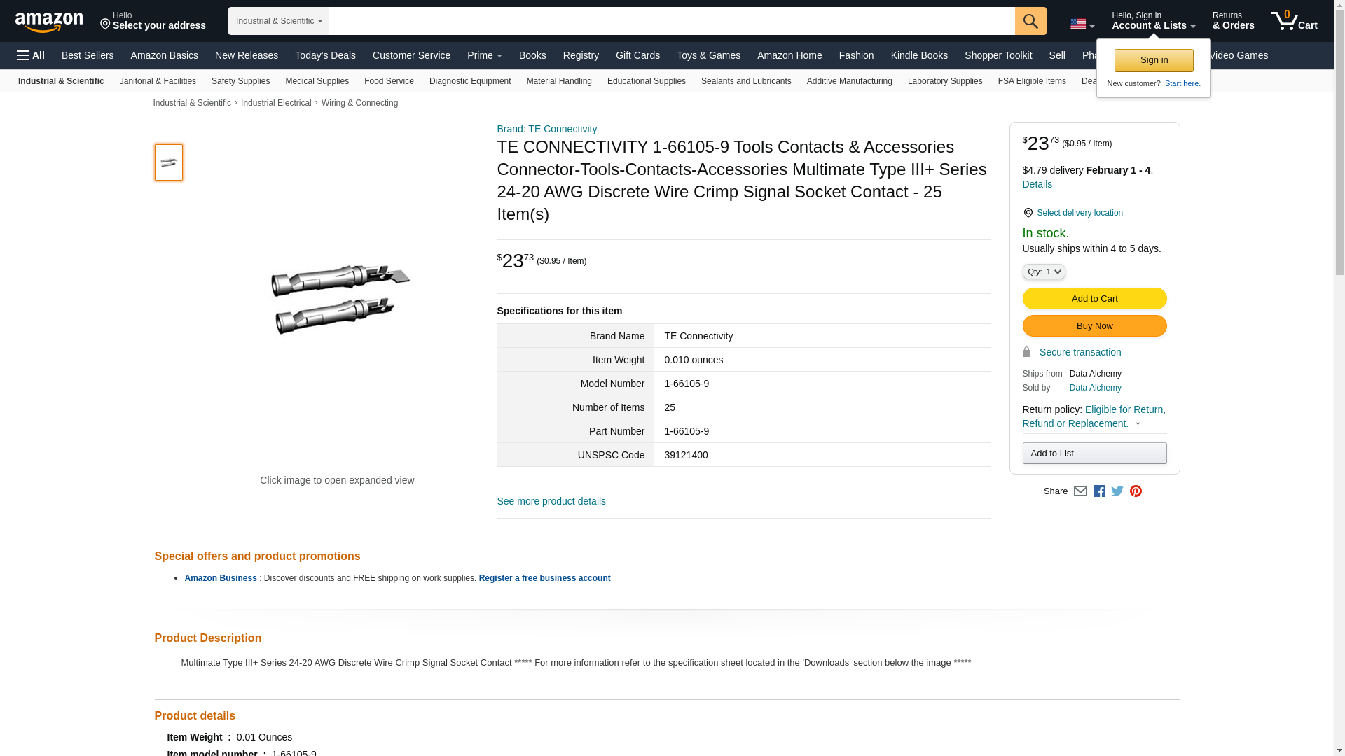 1-66105-9, Contact SKT 16 Size Crimp ST Cable Mount 20-24AWG Loose (100 Items)