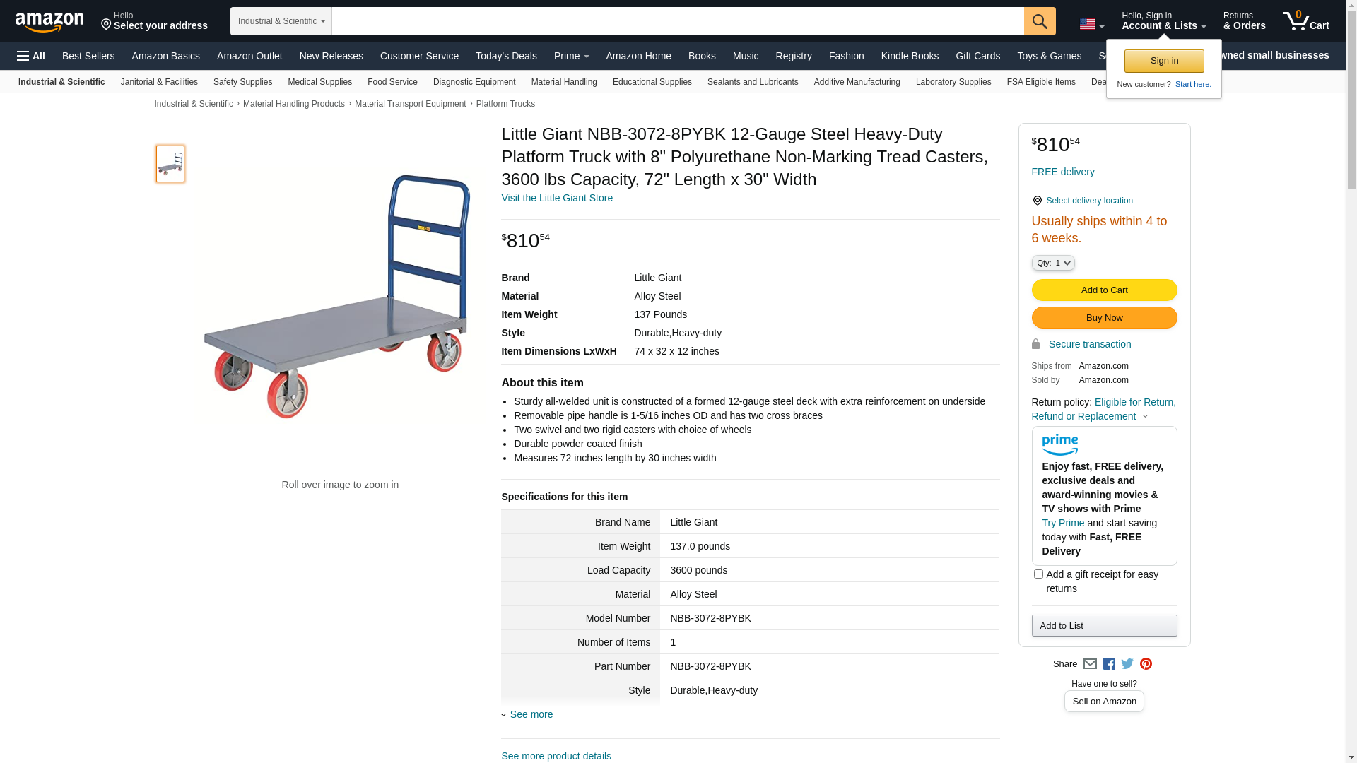 Little Giant NBB-3072-8PYBK 12-Gauge Steel Heavy-Duty Platform Truck with 8" Polyurethane Non-Marking Tread Casters, 3600 lbs Capacity, 72" Length x 30" Width