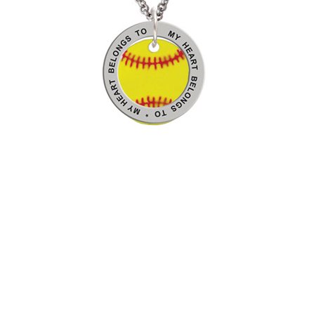Silver Tone 3/4" Enamel Softball My Heart Belongs To Affirmation Ring Necklace. Silver Tone Charm. Charm size is approx. 0.75 x 0.75 x 0.1 inches (HxWxD) including loop. Silver tone 2mm Belcher Chain Necklace is approx. 24 Inches with a Lobster Claw Clasp. Affirmation Ring is approx. 0.86 x 0.86 x 0.05 (HxWxD). This inspirational piece of jewelry is very meaningful. Its circular shape is symbolic for endless belief in the message that is imprinted around the ring. These are motivational or sentimental messages to the wearer. Perfect gift for that precious woman in your life. Tell her how much you care. PLEASE NOTE: Our products are lead safe, but are not intended for children 14 years and younger.