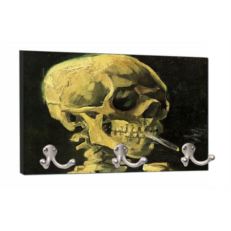 Artist Vincent Van Gogh's Skull of a Skeleton with a Burning Cigar Painting - 8" by 16" Mountable Coat Hanger Rack Household Decoration with Three Double Silver Hooks