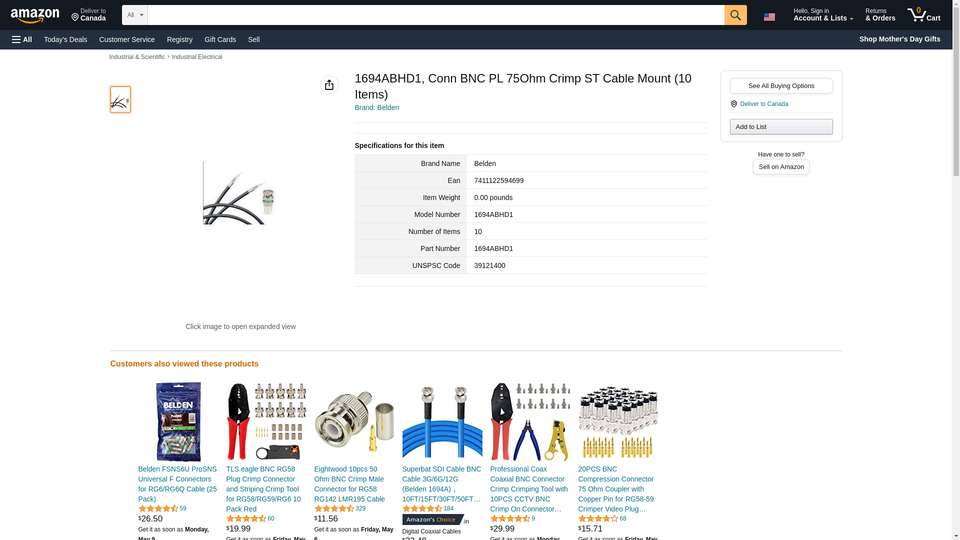 1694ABHD1, Conn BNC PL 75Ohm Crimp ST Cable Mount (10 Items)