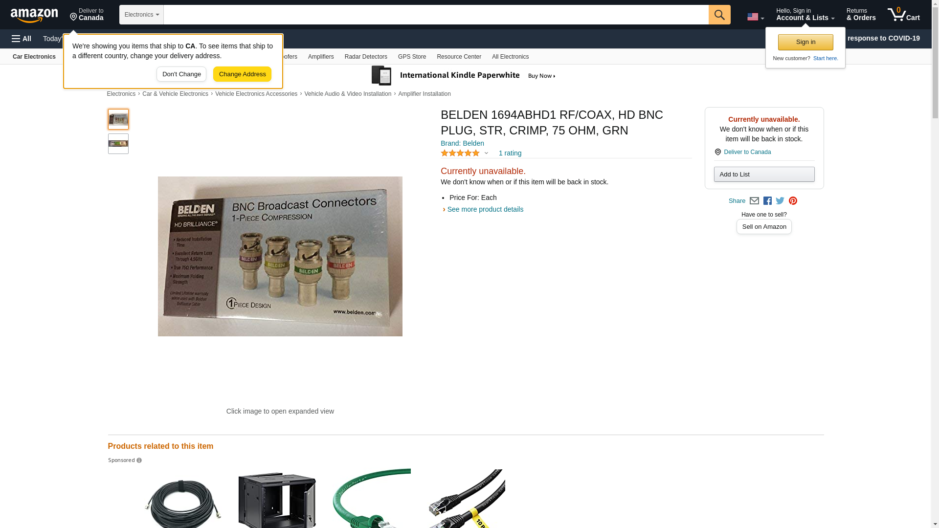 Belden 1694ABHD1 RF/Coax, HD BNC Plug, STR, Crimp, 75 OHM, GRN