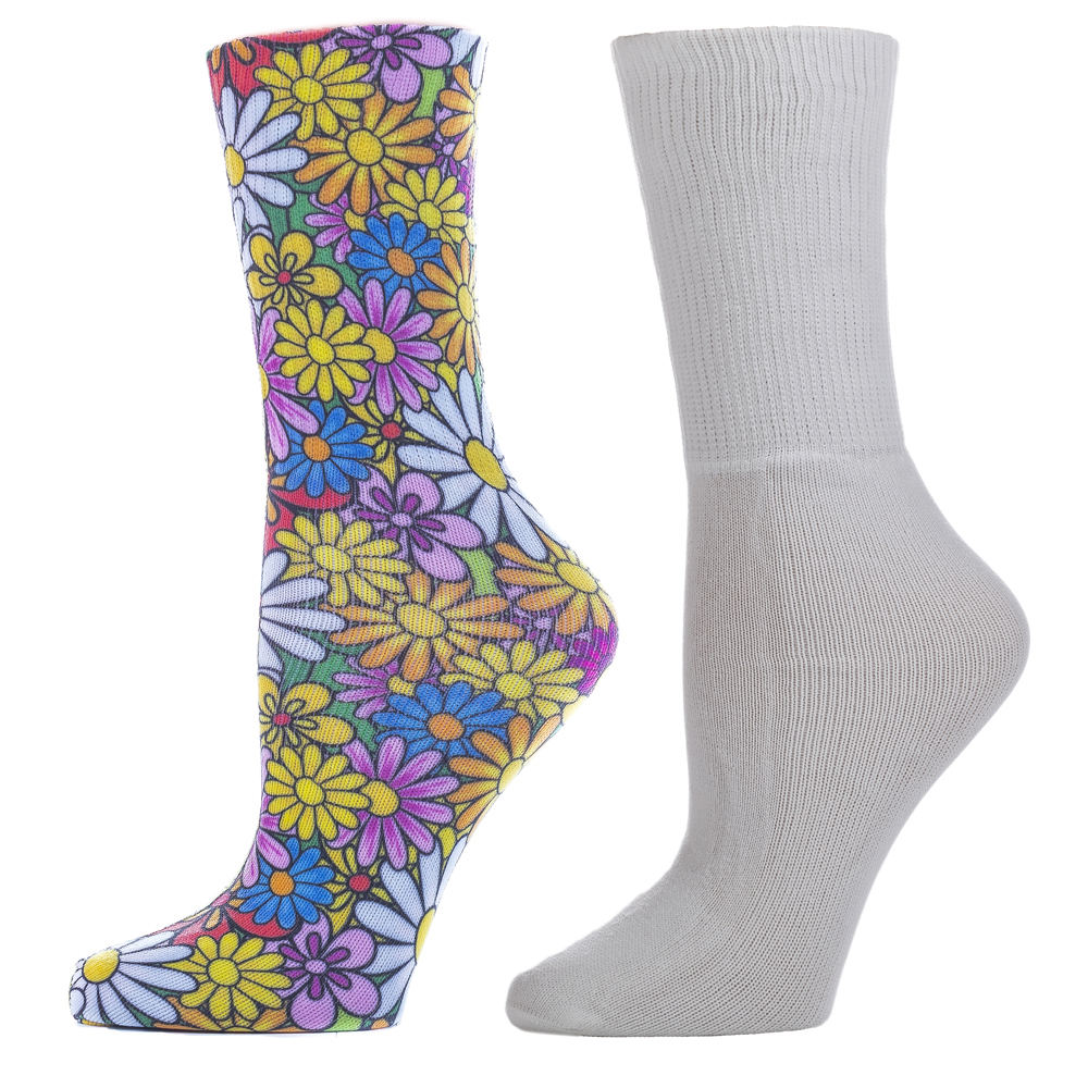 Celeste Stein Celeste-Stein-D-2144-WHT Diabetic Crew Sock Set with Colorful Daisies Pattern, Multi Color - Regular