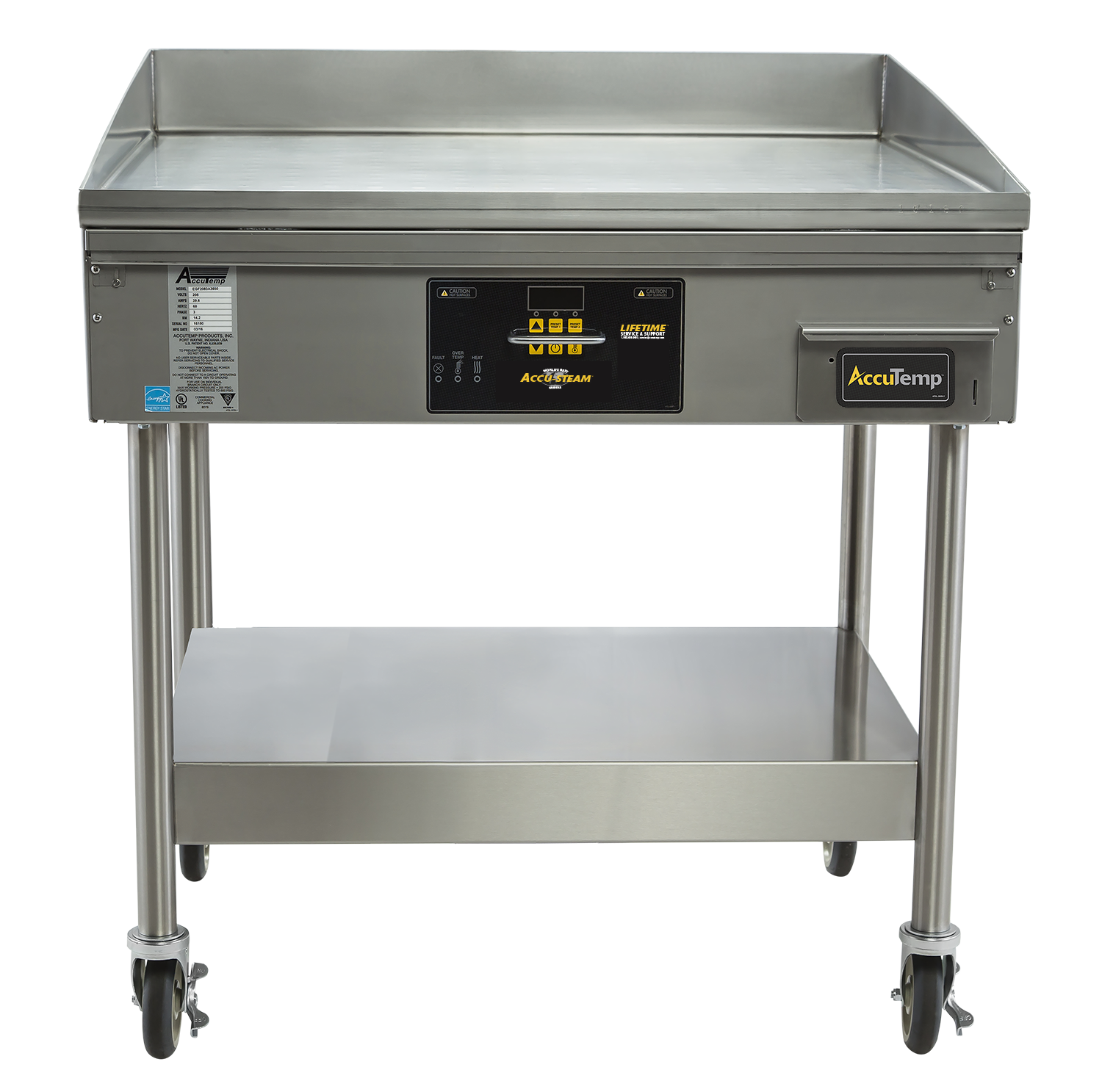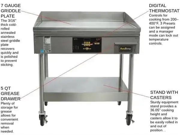 Accu-Steam? Griddle Product Description The Accu-Steam? Griddle is a versatile electric griddle that comes with a convenient stand featuring casters for mobility. It offers a spacious cooking area measuring 24" x 30", with a durable 7 ga. 304 stainless s