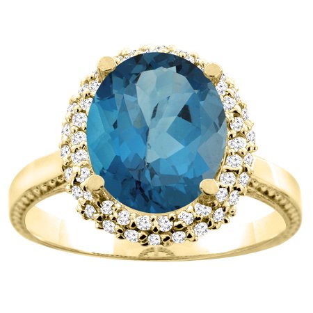 14K White/Yellow Gold Natural London Blue Topaz Double Halo Ring Oval 10x8mm Diamond Accent, sizes 5 - 10