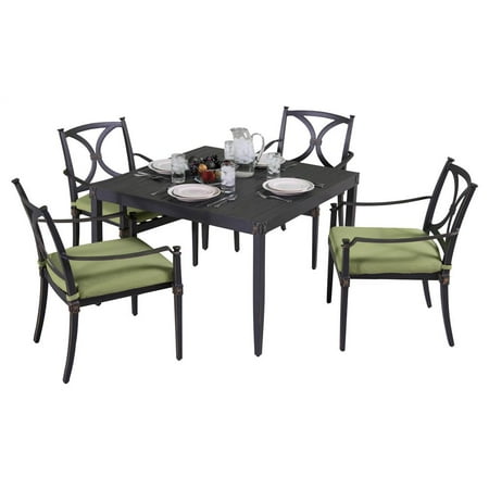 Includes four chairs and dining table. Bronze finished high quality, powder-coated, sand cast solid aluminum frame. Three layer weatherproof foam cushions with superior comfort while allowing moisture to completely drain. Covered in sunbrella fabric. Virtually maintenance free. Designed for comfort. Created by award-winning designer. UV, weather and fade resistant. Holds up great in salt and chlorinated environments. Perfect for coastal living. Plush cushions with breathable mesh bottom. Just wash with a hose and mild cleanser. Weight capacity: 220 lbs.. Warranty: One year. Made from 100% recyclable materials. Minimal assembly required. Dining table: 43 in. L x 43 in. W x 28 in. H. Chair: 27 in. W x 25 in. D x 35 in. H. Designed to accommodate an entire summer's worth of entertainment with an extra touch of style and sophistication. Get classically proportioned lines, light antiquing and superb attention to detail in an outdoor seating set that's durable and stylish enough to make your patio stand out for years.
