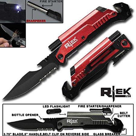 Rtek 9" Tactical Spring Assisted Red Survival 7 in 1 Rescue Pocket Knife LED Light Fire Starter Blade Sharpener Bottle Opener Glass Breaker Belt Cutter (Red)
