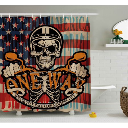 Skull Decor Shower Curtain, Vintage Motorcyclist Skull with a Helmet and American Flag Illustration , Fabric Bathroom Set with Hooks, 69W X 84L Inches Extra Long, Beige and Black, by Ambesonne