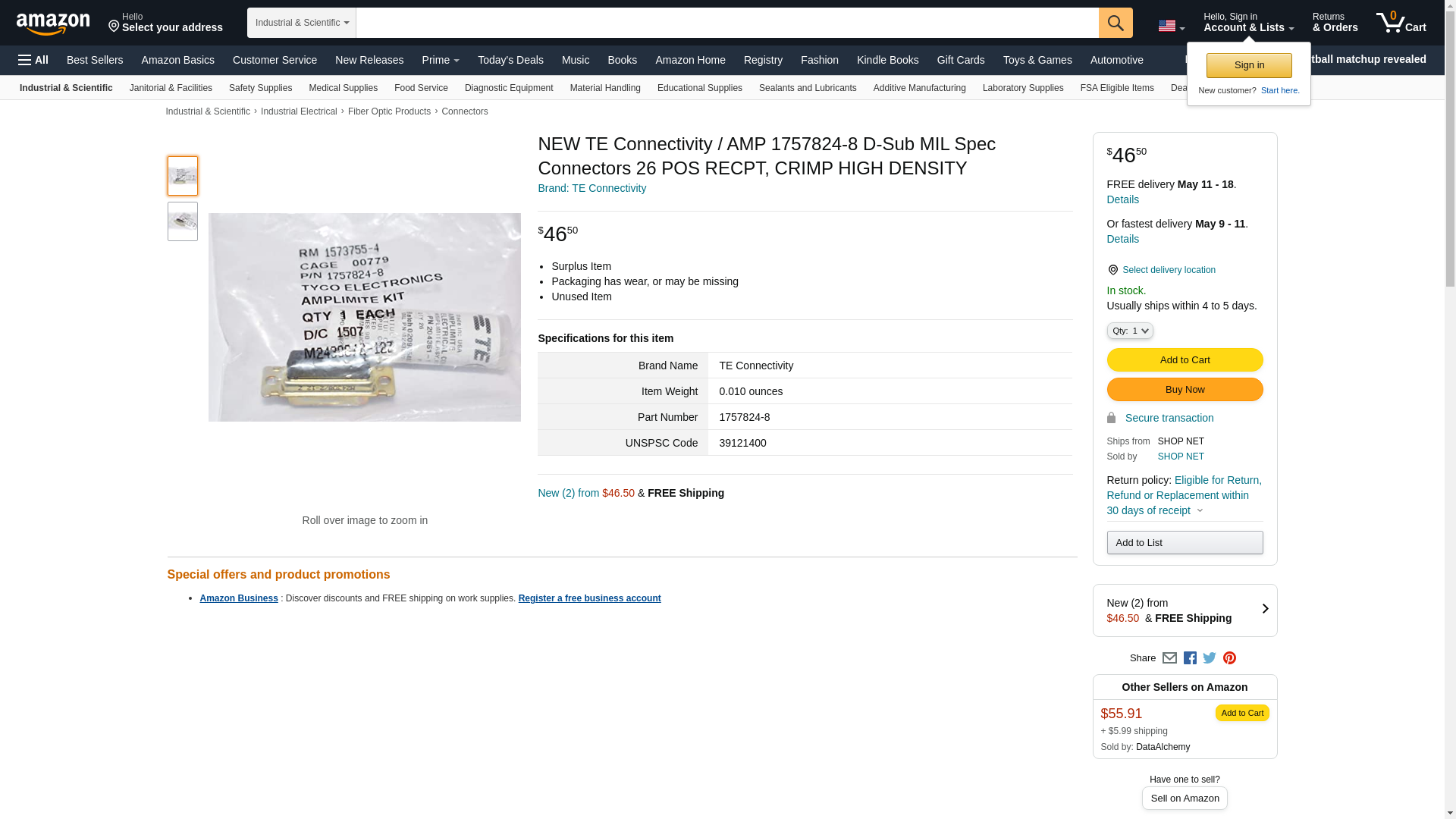 | Waldom | TE CONNECTIVITY AMP BRAND 1757824-8 | 2 | 131 | 1 | 2 @ $34.93, 8 @ $34.28, 16 @ $33.63, 31 @ $32.99, 100 @ $32.34 |