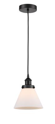 Innovations Lighting Bell 1 Light 8 inch Matte Black Mini Pendant. Rated Lifetime Hours: 2000 / Room Recommendation: Kitchen/Office/Game Room/Dinette/Kitchenette / Wire/Cord Color: Black Fabric / Canopy Included: Yes / Canopy Diameter: 4.75 / Sloped Ceiling Adaptable: Yes / Cord Length: 120.00 / Dimable: Yes / Shade Included: Yes / Shade Dimensions: 8 x 5.75.