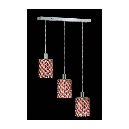 3 ft. Chain/Wire Included. Bulbs not included. Crystal Color: Bordeaux (Red). Chrome finish. Number of Bulbs: 3. Bulb Type: GU10. Bulb Wattage: 55. Max Wattage: 165. Voltage: 110V-125V. Assembly required. Meets UL & ULC Standards: Yes. 4.5 in. W x 14.5 in. D x 8 to 48 in. H (8lbs.). Description of Crystal trim:Royal Cut, a combination of high quality lead free machine cut and machine polished crystals & full-lead machined-cut crystals..SPECTRA Swarovski, this breed of crystal offers maximum optical quality and radiance. Machined cut and polished, a Swarovski technicians strict production demands are applied to this lead free, high quality crystal.Strass Swarovski is an exercise in technical perfection, Swarovski ELEMENTS crystal meets all standards of perfection. It is original, flawless and brilliant, possessing lead oxide in excess of 39%. Made in Austria, each facet is perfectly cut and polished by machine to maintain optical purity and consistency. An invisible coating is applied at the end of the process to make the crystal easier to clean. While available in clear it can be specially ordered in a variety of colors.Not all trims are available on all models.